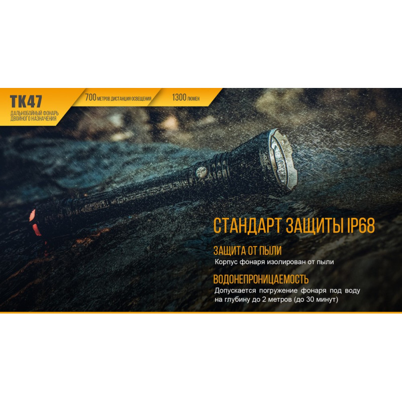Модель Fenix ТК47 (2017) оснащена металевим корпусом з авіаційного алюмінієвого сплаву. Він виготовляється двошаровим і покривається шаром жорсткого анодування, який забезпечує додаткову корозійну стійкість. Ліхтар зроблений повністю непроникним для пилу і води, що дозволяє використовувати його деякий час під водою, але не глибше 2 метрів. Fenix ТК47 (2017) зацікавить туристів, мисливців, рятувальників і всіх людей, які потребують в яскравому і багатофункціональному ліхтарі.