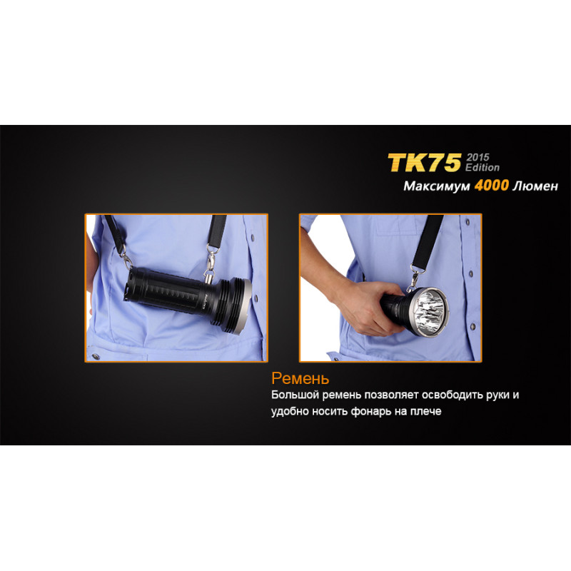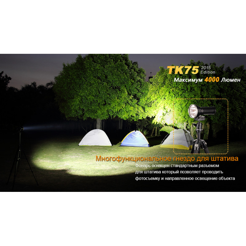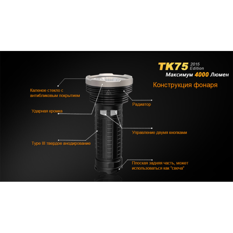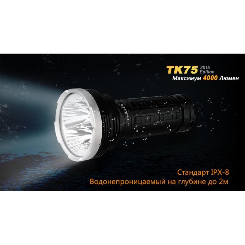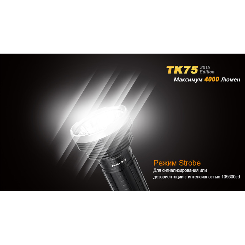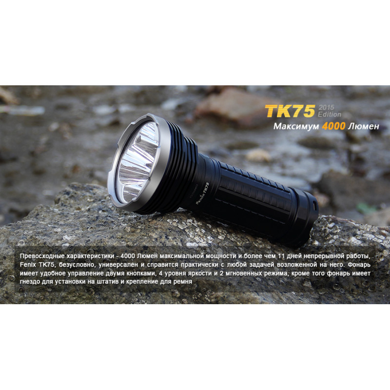 Модель Fenix TK75 (2015) використовує в якості джерела світла чотири світлодіода Cree XM-L2 (U2). Вони обрані за відмінні показники довговічності і яскравості. Спільно, чотири діода дають до 4000 люмен світла. А ресурс використання кожного з цих діодів становить не менше 50 000 ч. Ліхтар працює в шести режимах, з яких чотири відведені на рівні яскравості, а ще два забезпечують миттєвий доступ до постійного і блимати світла.