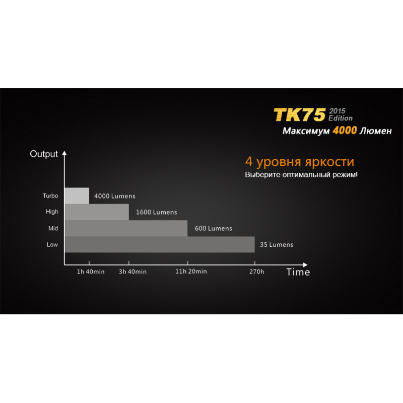 При розрахунку часу роботи ліхтаря в кожному режимі яскравості, виробники керувалися даними, отриманими при використанні фірмових акумуляторів ємністю 3400 маг. З цими елементами живлення Fenix TK75 (2015) пропрацює в режимі Turbo з яскравістю 4000 люмен 1 год 40 хв. Наступний по яскравості режим освітлення — Hihg з показником 1600 люмен. У ньому ліхтар буде світити 3 год 40 хв. Яскравість світла в режимі Mid становить 600 люмен, а час роботи - 11 год 20 хв. Довше всього, 270 год, Fenix TK75 (2015) пропрацює в режимі Low з яскравістю 35 люмен. Яскравість променя в режимах Burst і Strobe досягає верхньої позначки (4000 люмен). Але час роботи для цих режимів не прораховують, оскільки вони не передбачають тривалої роботи у одному сеансі і не дають постійного світлового потоку.