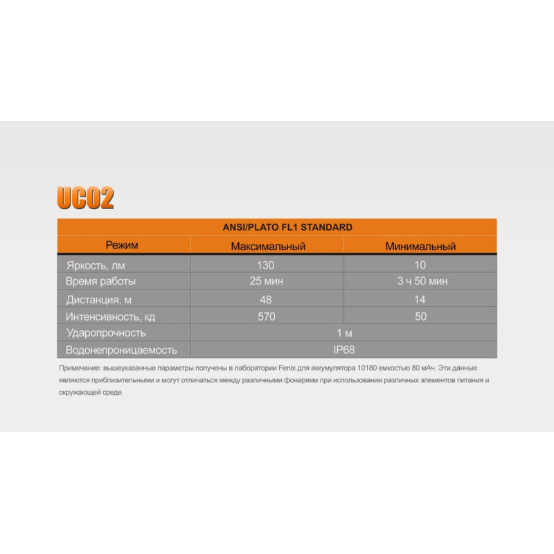 Fenix UC02 працює в двох режимах. Перший з них дає промінь яскравістю 130 люмен, який видно на відстані 48 метрів. Штатного акумулятора достатньо для підтримки цього освітлення протягом 25 хвилин. Другий режим зроблений набагато більш економним. Він розрахований на яскравість всього 10 люмен, зате продовжує час роботи ліхтаря до 3 годин 50 хвилин. Дистанція освітлення в цьому режимі сягає 14 метрів.