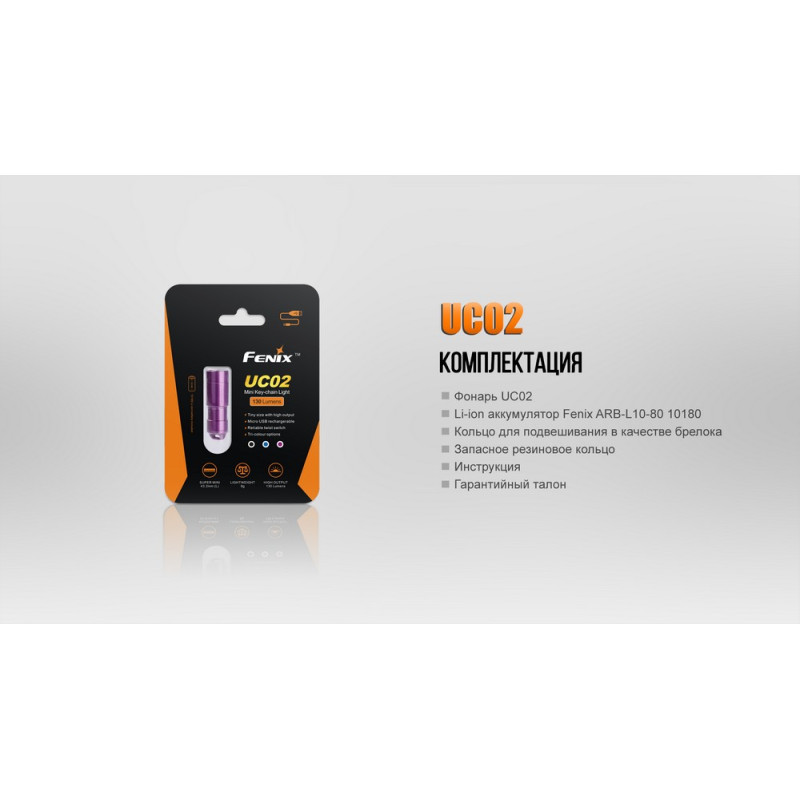 Компанія Fenix пропонує ще одну модель ліхтарика-брелока - Fenix UC02. За розмірами, він зовсім не великий, що відповідає категорії брелків. Вага ліхтаря, якщо не вважати акумулятор, становить 8 грам. Його цілком можна носити разом з комплектом ключів або ж просто в кишені. Однак ця модель має безліч варіантів практичного застосування.