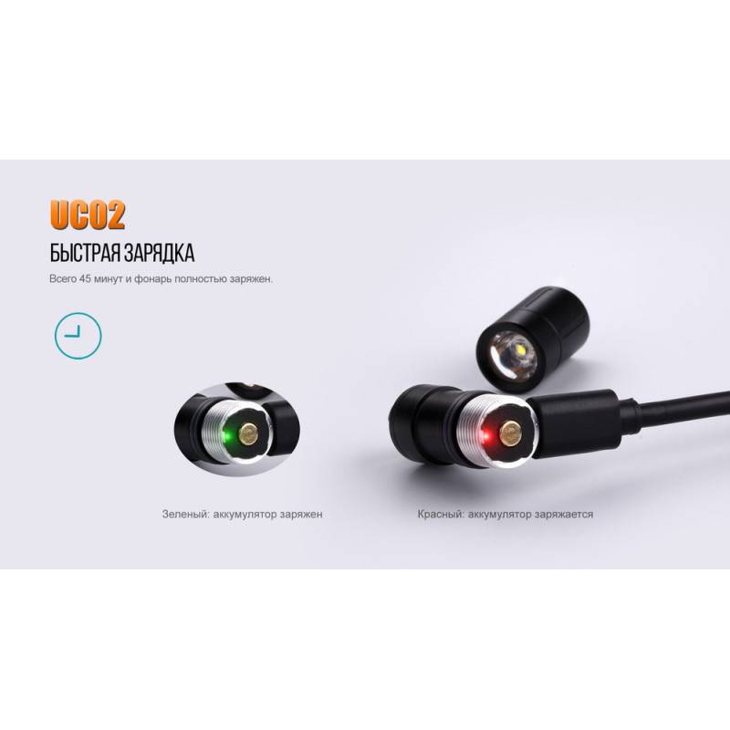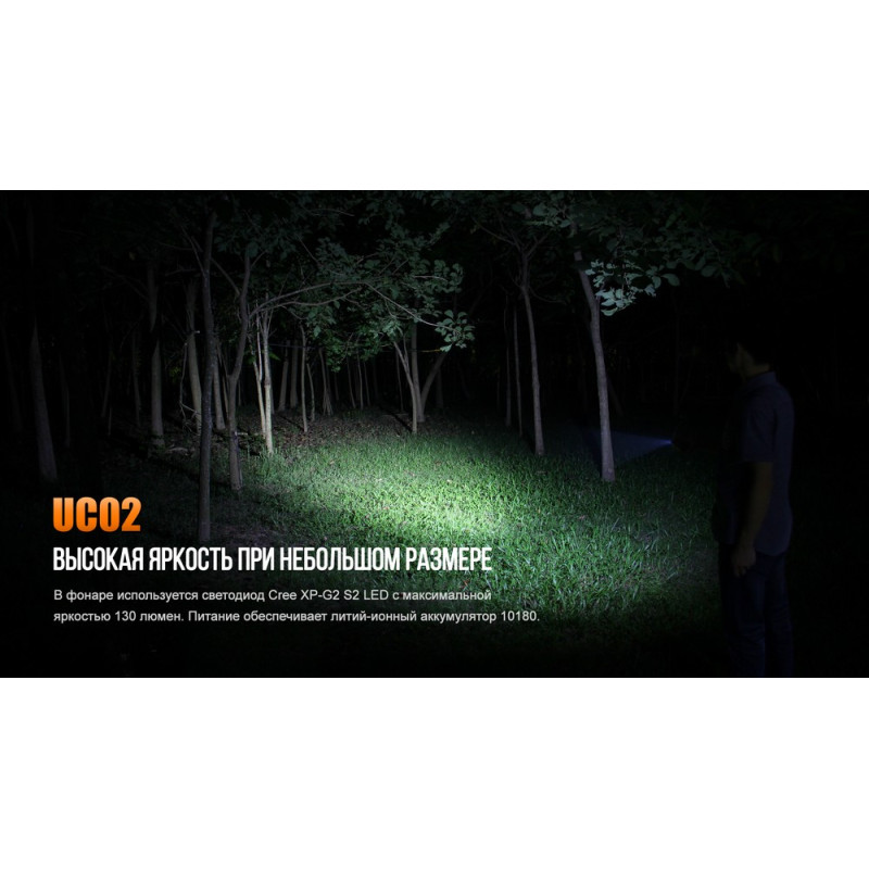 Модель Fenix UC02 працює на діоді хорошої якості - Cree XP-G2 S2. Він дає білий світ і зберігає працездатність протягом п'ятдесяти тисяч годин освітлення. Це гарантує більшу довговічність ліхтаря (близько 5,5 років безперервного освітлення).