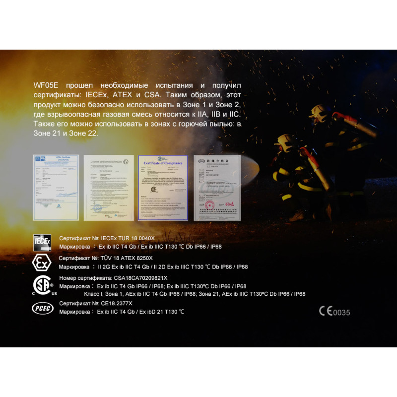 У деяких умовах ймовірність вибухів, а також пожеж вище, ніж у повсякденній обстановці. Це стосується підприємств газодобувної та нафтопереробної галузі, текстильних фабрик, хімічних заводів. Навіть найменша іскра в цих умовах може призвести до трагедії. Ліхтар Fenix WF05E зроблений так, щоб цього уникнути.