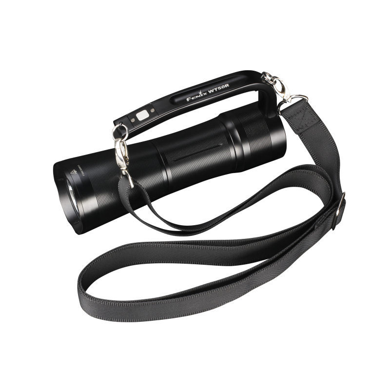 Ліхтар Fenix WT50R досить великий за розміром і важкий. Він важить 742 м, тому в комплекті з ліхтарем є широкий ремінь на плече. З ним використовувати ліхтар протягом тривалого часу буде зручніше. Також його можна встановити на штатив, адже на корпусі є стандартний роз'єм для кріплення на трипод.