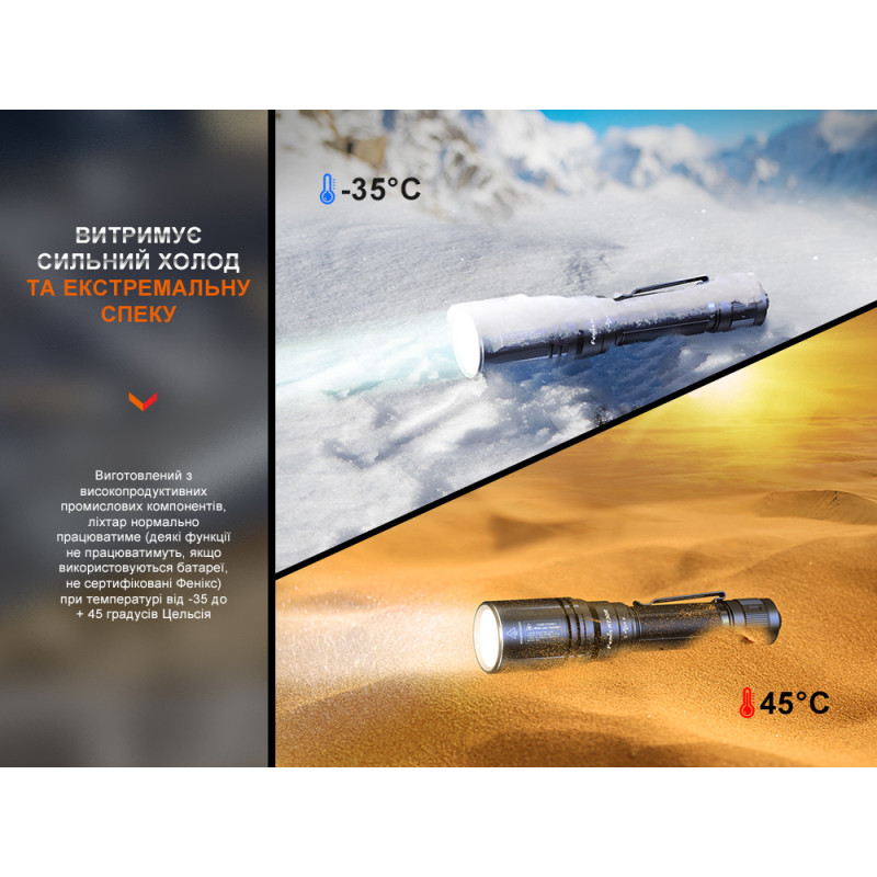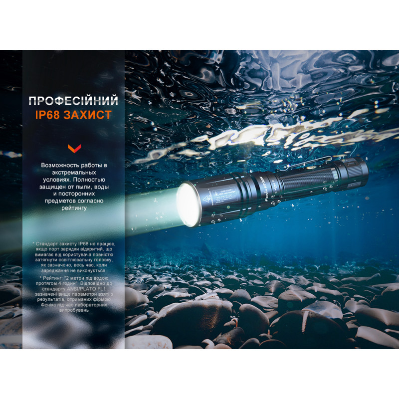 Враховуйте, що вищезазначені параметри були отримані в процесі здійснення лабораторних дослідів. Для цього використовували літій-іонний акумулятор Fenix ARB-L21-5000 V2.0 при температурі 21+-3 градуси Цельсія та вологості повітря близько 50%-80%. Фактичні параметри роботи ліхтаря можуть відрізнятися від наведених залежно від умов зовнішнього середовища та задіяного акумулятора.