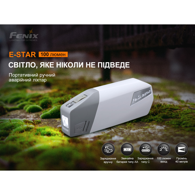 Ліхтар моделі Fenix E-STAR є портативним приладом з автономним живленням для екстрених випадків, в тому числі для районів з відсутністю стабільного Електропостачання і районів, постраждалих від стихійних лих.