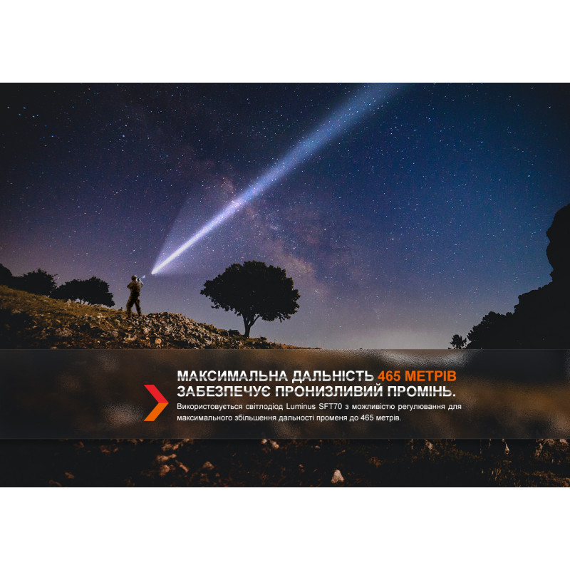 Fenix TK20R має кілька корисних опцій. Серед них є захист від перегріву. Він спрацьовує кожного разу, коли температура корпусу підвищується до 60°C, і миттєво знижує потужність світла, щоб нагрівання не позначилося на термін служби електроніки негативним чином. Також передбачено поступове зниження яскравості під час падіння кількості заряду в елементі живлення.