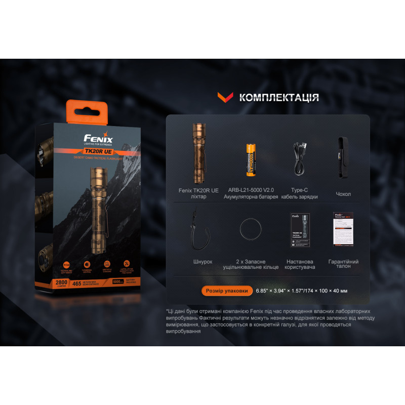 Ліхтар Fenix TK20R UE, акумулятор ARB-L21-5000 V2.0, кабель USB Type-C для заряджання, два запасні ущільнювачі, темляк, чохол, інструкція користувача, гарантійний талон.