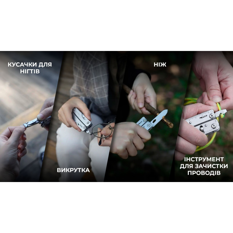 Мультинструмент чудово пристосований під польові умови, з якими має справу турист чи мандрівник. Так, він допомагає підтримувати ваші нігті в порядку і робити манікюр навіть якщо ви в дорозі або на природі. Плоскогубці дадуть можливість перерізати дріт або підкрутити гвинт. Гострий меч ножа досить хороший для того, щоб стругати деревину, форма леза – drop point. Ніж легко відкрити однією рукою, чіпляючи великим пальцем за спеціальний отвір. Маленькі і великі плоскі викрутки служать для дрібних ремонтних робіт. За допомогою шпильки ви можете витягти сім-карту зі смартфона, відкривши його задню кришку на корпусі. Більше немає необхідності шукати придатний пристрій. Усі функції вже зібрані у мультитулі. Відкривачка для пляшок допоможе швидко відкрити кришку тари. Зручність у дрібницях. До того ж модель дуже ергономічна.