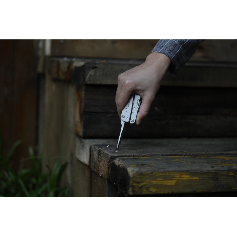 Ножиці відмінно підійдуть для того, щоб, наприклад, перерізати мотузку. Комфортна в утриманні та захопленні рукоять. Склобій з керамічним матеріалом допоможе розбити вікно в екстреній ситуації. Округлий дизайн склобою допомагає уникнути подряпин. Твердість матеріалу близько 90 одиниць Роквелла. Дуже міцний склобій. До мультитулу додаються змінні біти. Це дуже практично для здійснення будь-якого дрібного ремонту, якщо потрібно. Гострий ніж оптимальний для того, щоб підстругувати олівець. У складі високоякісний матеріал – нержавіюча сталь.