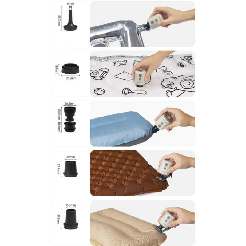 - Насоси. Робочий тиск повітря складає 4,5 кПа, а максимальна продуктивність — 180 л/хв, що дозволяє надути матрац приблизно за 40 с або надувну подушку за 20 с. Комплектація доповнена набором з 5 насадок для комфортної експлуатації.