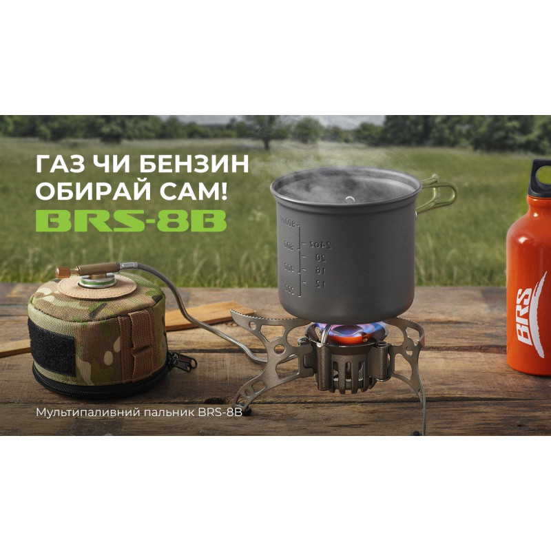 Мультипаливний пальник BRS-8B є портативним пристосуванням для пікніків, туристичної діяльності, різних видів активного відпочинку. Нафтогазове подвійне призначення. Потужність пальника досягає 4500 Вт. Матеріали у складі виробу: сплави алюмінію та міді.
