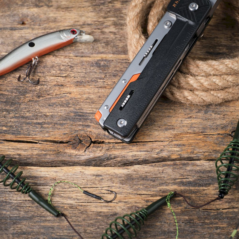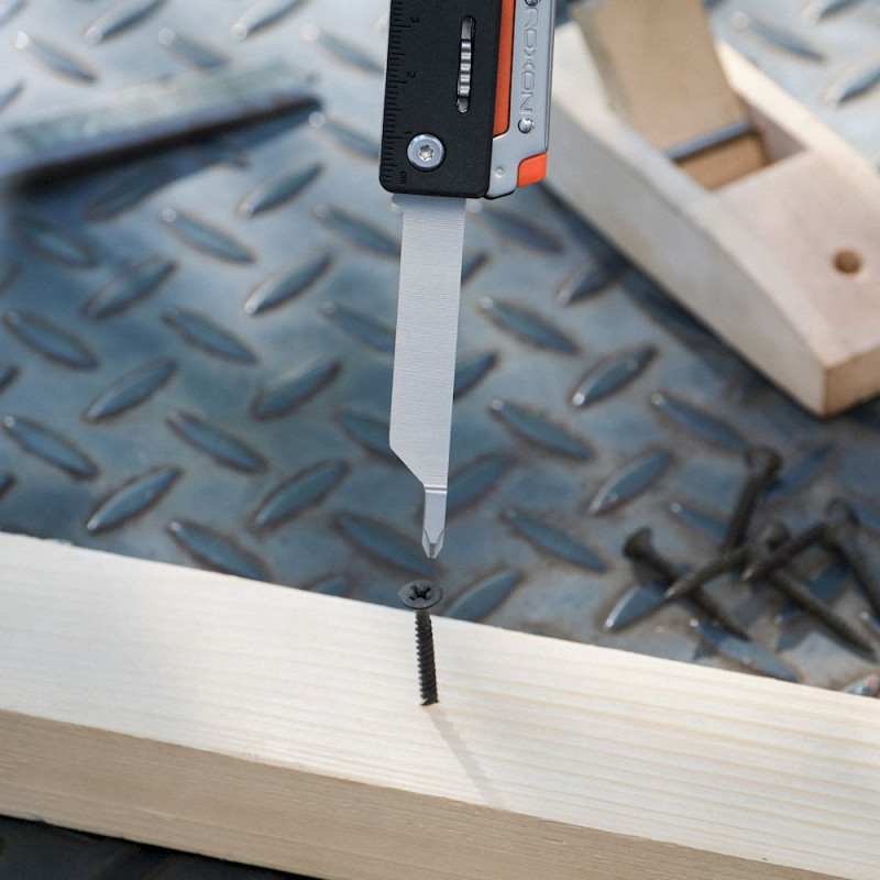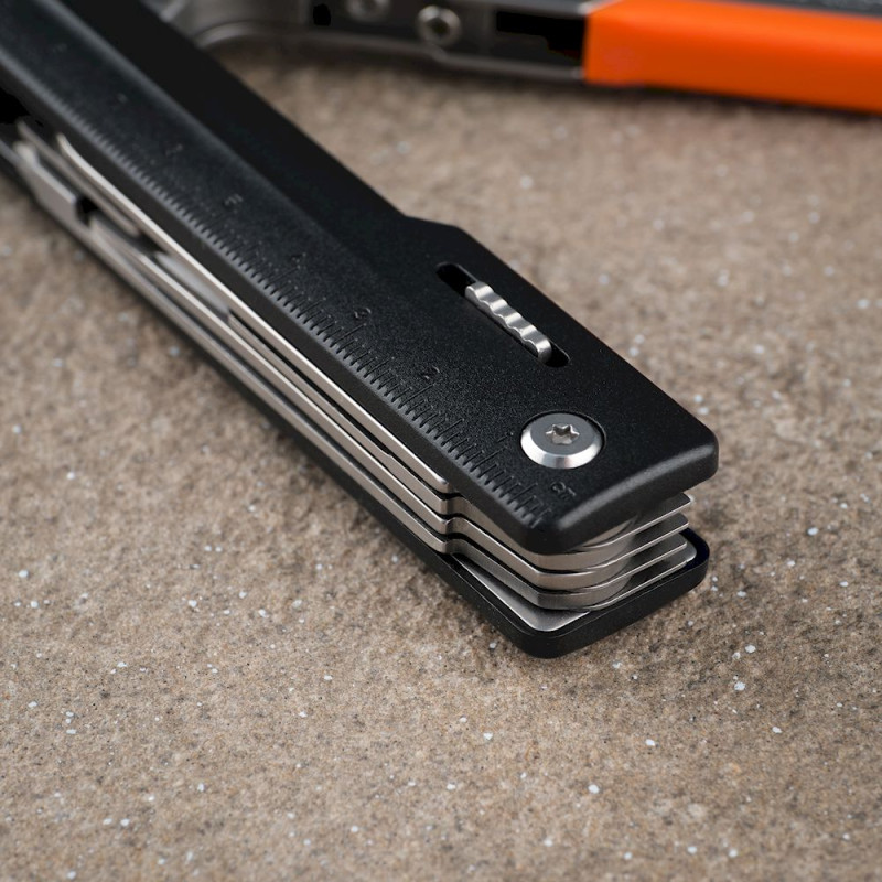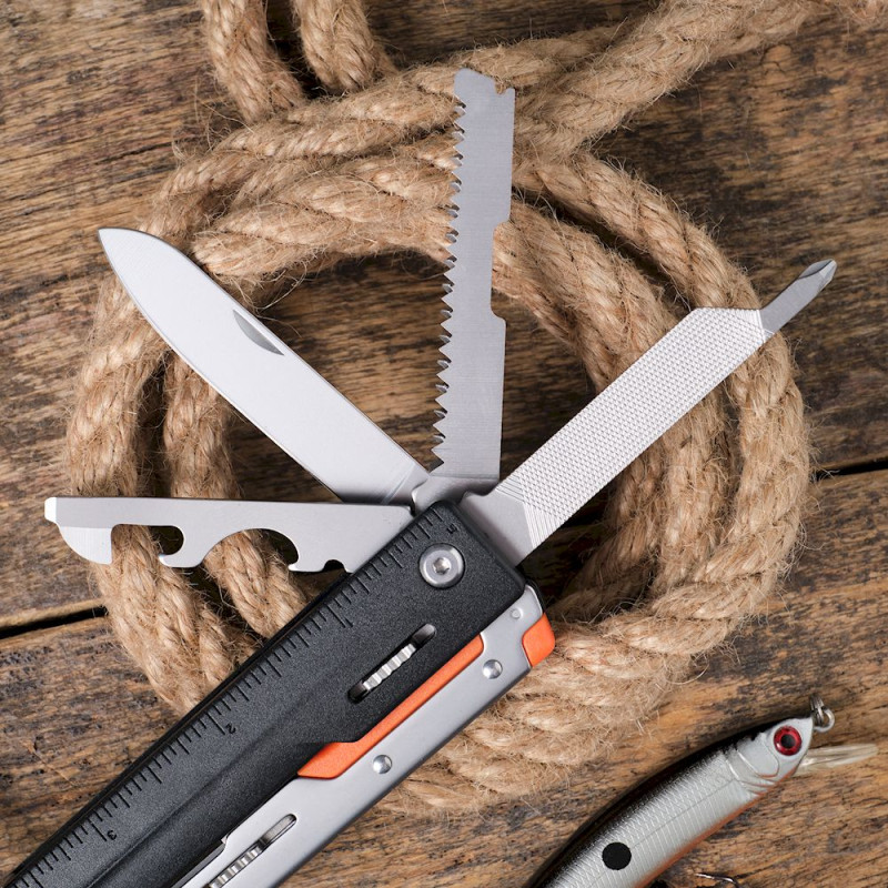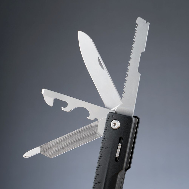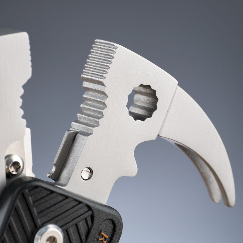 У хвіст рукояті інтегровано чотири допоміжні інструменти: клинок форми Drop Point з прямою ріжучою кромкою, міні пила з серейторним заточенням, один елемент із вбудованим стрипером, консервним ножем і плоскою викруткою, а також пилочка для нігтів із наконечником у вигляді викрутки Phillips. Кожен із елементів можна дістати з рукояті однією рукою і зафіксувати до клацання, щоб вони не закрилися під час використання та не поранили руку.