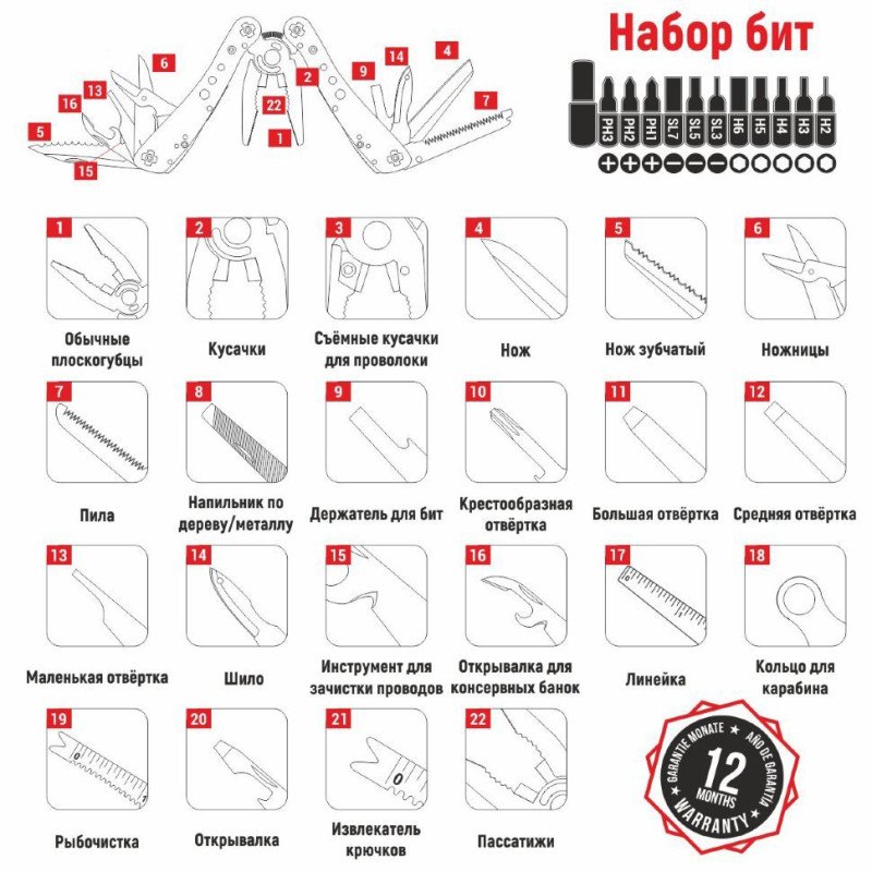Розмір інструменту - 10,5х5см. Товщина - 1,5 см. При цьому комплектність мультитула становить 22 інструменту, що робить його багатофункціональним і при цьому по-справжньому ергономічним.
