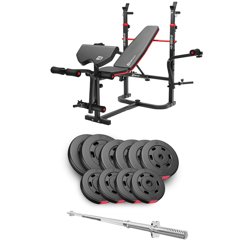Набор Premium 59кг со штангой и скамьей HS-1065HB Pro - идеально подобранный комплект с функциональной лавкой и наилучшим сочетанием количества и веса дисков, чтобы организовать дома полноценный спортзал для силовых тренировок.