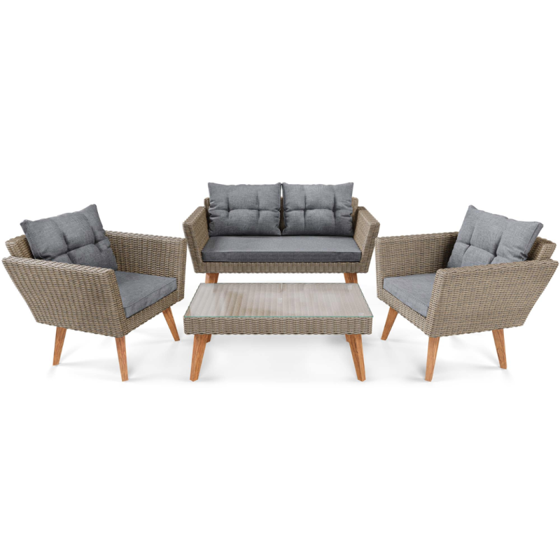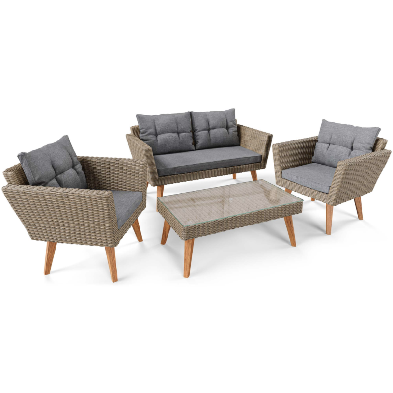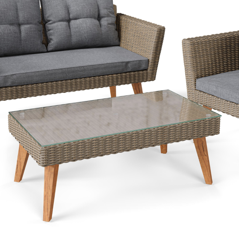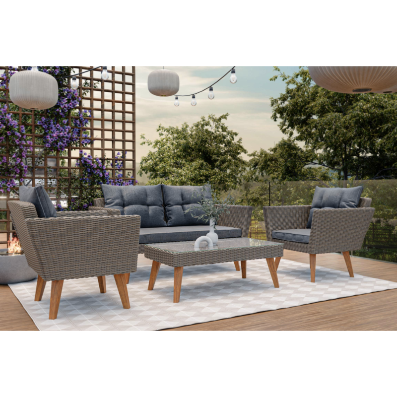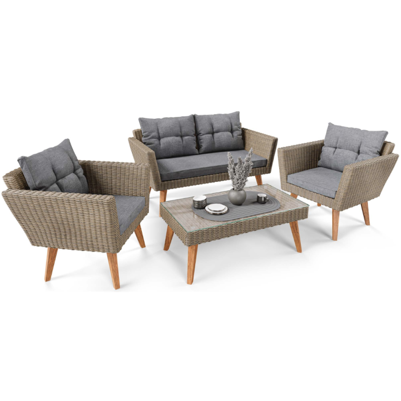 Теплые солнечные дни побуждают отдыхать на открытом воздухе в окружении природы. Набор садовой мебели Riva создает уютное и функциональное пространство для отдыха, общения и времяпрепровождения на свежем воздухе, добавляя комфорта и уюта. Четырехместный комплект садовой мебели от Di Volio - это стильный комплект для обустройства загородных домов и городских квартир, зон отдыха. Комплект, состоящий из дивана, двух кресел и стола со стеклянной столешницей, идеально подойдет для совместного времяпровождения с семьей и друзьями. Стальная конструкция в сочетании с ротангом, устойчивым к внешним факторам, гарантирует долговечность мебели, а удобные подушки толщиной 6см обеспечивают подходящий комфорт. Ножки из древесины акации идеально сочетаются с эстетикой мебели, придавая элегантность и природный характер. В комплект садовой мебели Riva мы добавили практичный защитный чехол, который закроет мебель после окончания сезона или защитит во время дождя. Вы можете быть уверены в качестве и долговечности продукта, поскольку фирма-производитель Di Volio предоставляет гарантию на 24 месяца.