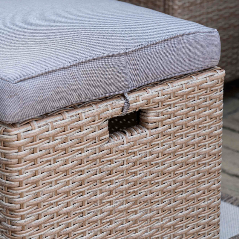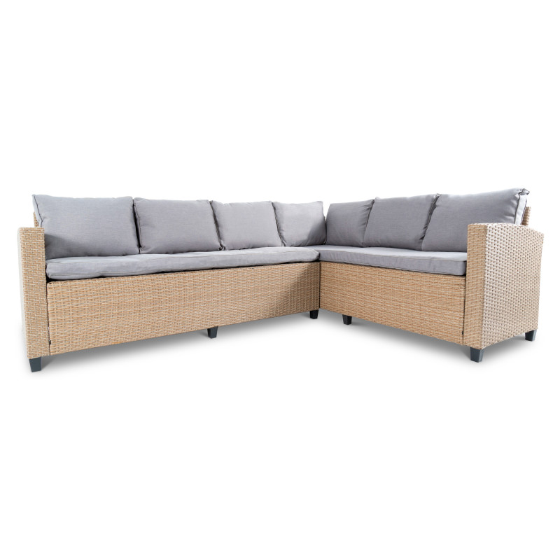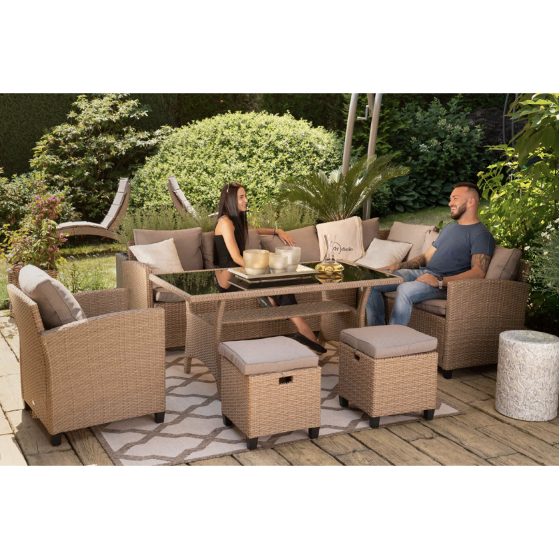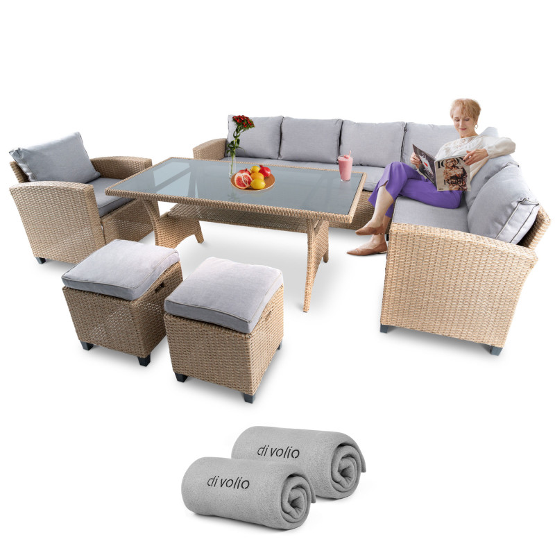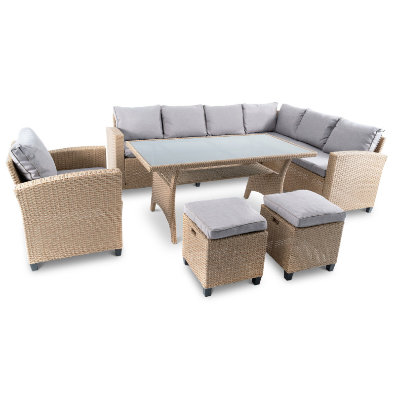 Желаете провести время с друзьями или семьей на природе? Набор мебели Rossano от Di Volio - будет отличным выбором! Он идеально подходит не только для сада, но и легко разместится на большом балконе или террасе. Набор состоит из 6-местного углового дивана, кресла, большого стола и 2-х пуфов. Большой диван можно разложить на два отдельных 3-х местных. Благодаря использованию качественного техноротанга, плетеная мебель Rossano обеспечит вам эстетическое наслаждение, комфорт и удобство! Диван, кресло и пуфы оснащены удобными мягкими подушками. Теплый цвет техноротанга придает интерьеру дополнительный уют.