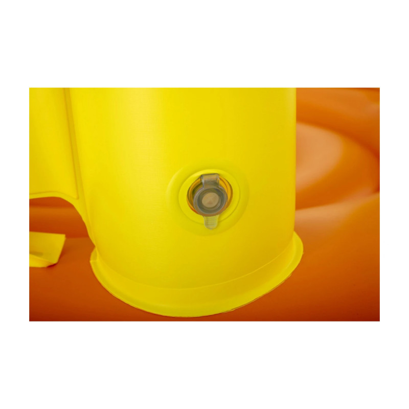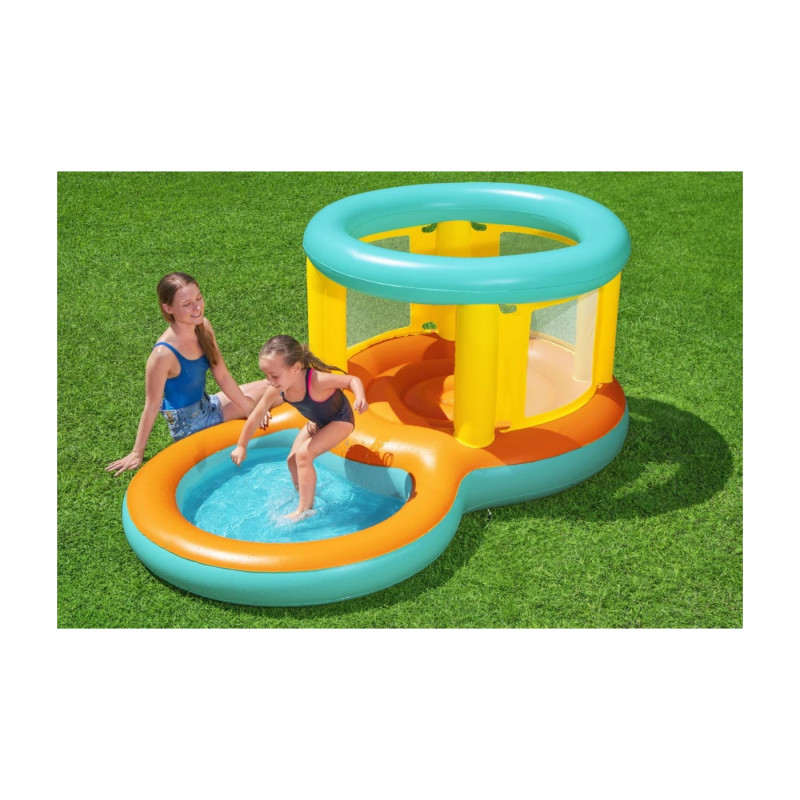 Надувний ігровий майданчик 2-в-1 поєднує в собі функції дитячого басейну та платформи для стрибків. Басейн об'ємом 70 літрів є ідеальним місцем для відпочинку в спекотні дні. Діти можуть насолоджуватися не тільки купанням, але й стрибати на платформі для стрибків. Він огороджений прозорими сітчастими стінами, що гарантує безпеку малюків. На площадці для стрибків можуть стрибати діти вагою приблизно до 55 кг.