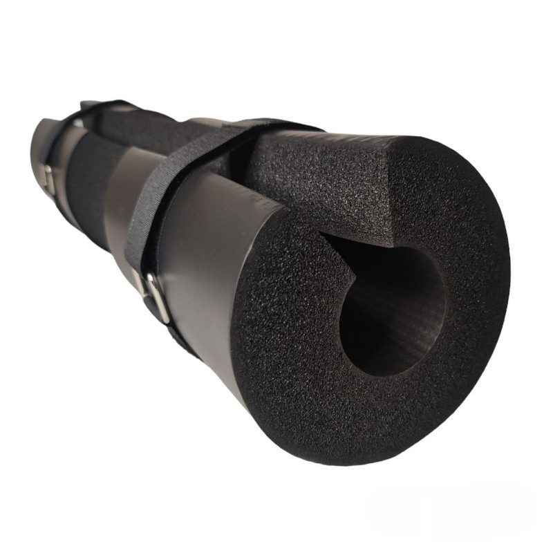Накладка выполнена из вспененного каучука (NBR), материал довольно плотный и приятный на ощупь, сохраняет свою форму и свойства в течение длительного времени. Это позволит надежно защитить спину и плечи от повреждений металлическим грифом. Длина накладки - 41 см, внешний диаметр - 9 см, посередине расположен специальный вырез для шеи. В комплекте два ремешка на липучках, которые позволяют лучше зафиксировать бампер на грифе.