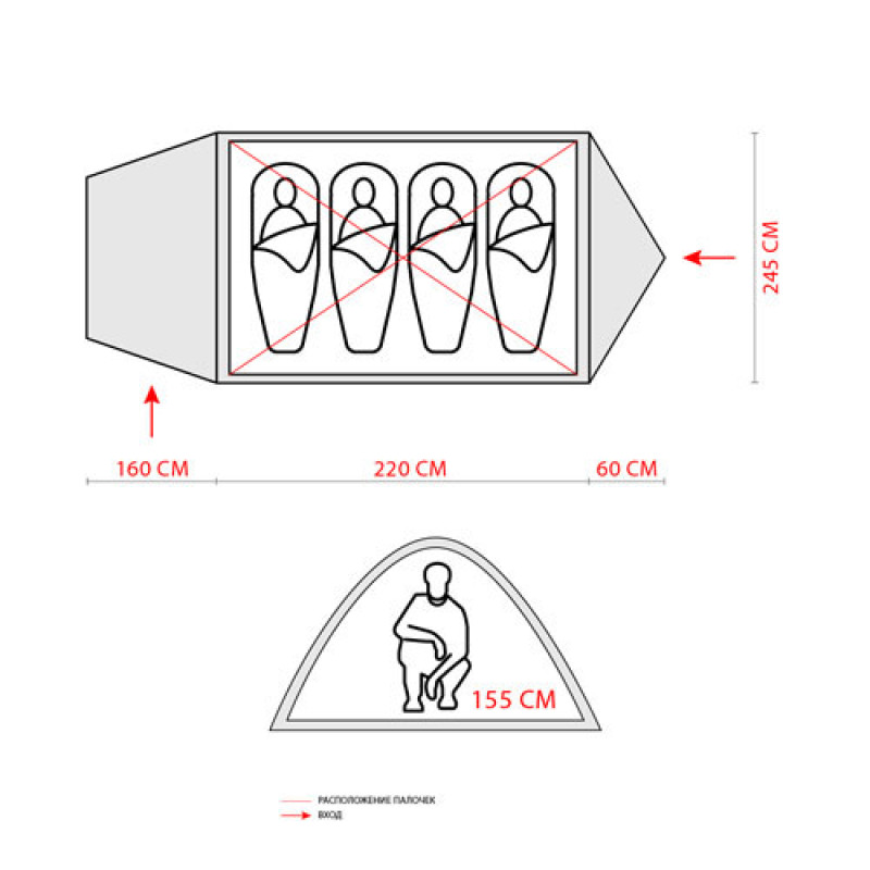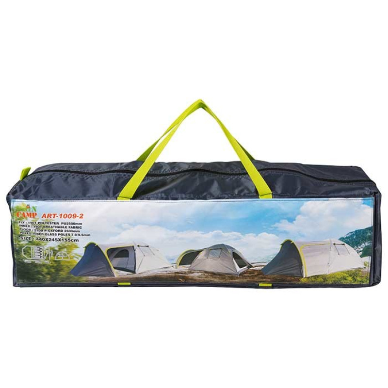 Палатка GreenCamp предназначена для комфортного размещения 4 человек. Он имеет просторную комнату с длиной 2,2 метра, что предоставляет дополнительную свободу для проживания. Палатка оснащена тамбуром спереди, который идеально подходит для хранения вещей, обуви или снаряжения.