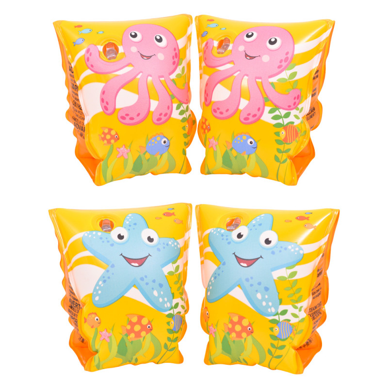 Яркий дизайн с изображениями морских обитателей привлекает внимание и делает ребёнка заметным в воде, а также превращает обычное купание в увлекательную игру. Компактные размеры (23 × 15 см) и возможность быстро сдуть нарукавники позволяют удобно брать их с собой на отдых или хранить дома без лишнего места.