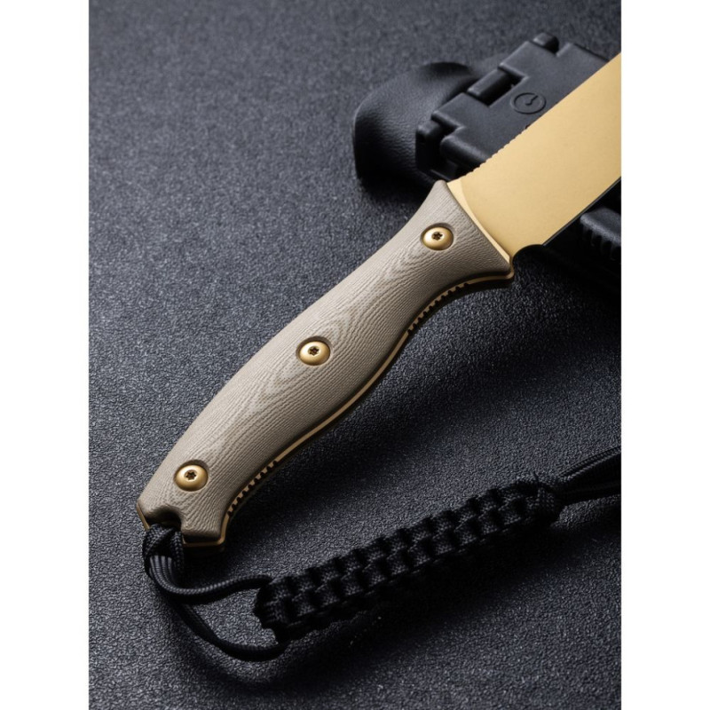 Вага ножа складає 111.5 г з урахуванням паракорду, який просмикнуто у хвостовий отвір. У комплекті також є міцні піхви з кайдекса для зручного носіння. Піхви оснащені Т-подібною кліпсою, розробленою дизайнером Бобом Терзуола (Bob Terzuola).