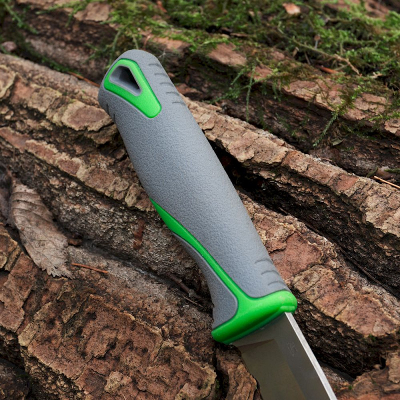 На руківʼї завдовжки 115 мм відсутні гострі краї, запобігаючи натиранню долоні, що особливо важливо під час тривалої та інтенсивної роботи з інструментом. Матеріал руківʼя комбінований: основа виготовлена з поліпропілену (PP) з покриттям із термопластичної гуми (TPR). Це поєднання наділяє руківʼя міцністю та довговічністю, зокрема воно не боїться механічного впливу та зберігає цілісність у разі сильного удару. Нековзна, ребриста поверхня матеріалу зводить до нуля ковзання інструменту у вологій долоні, а дрібні насічки ближче до клинка формують упор під палець.