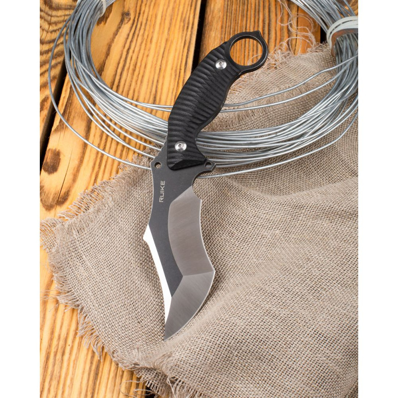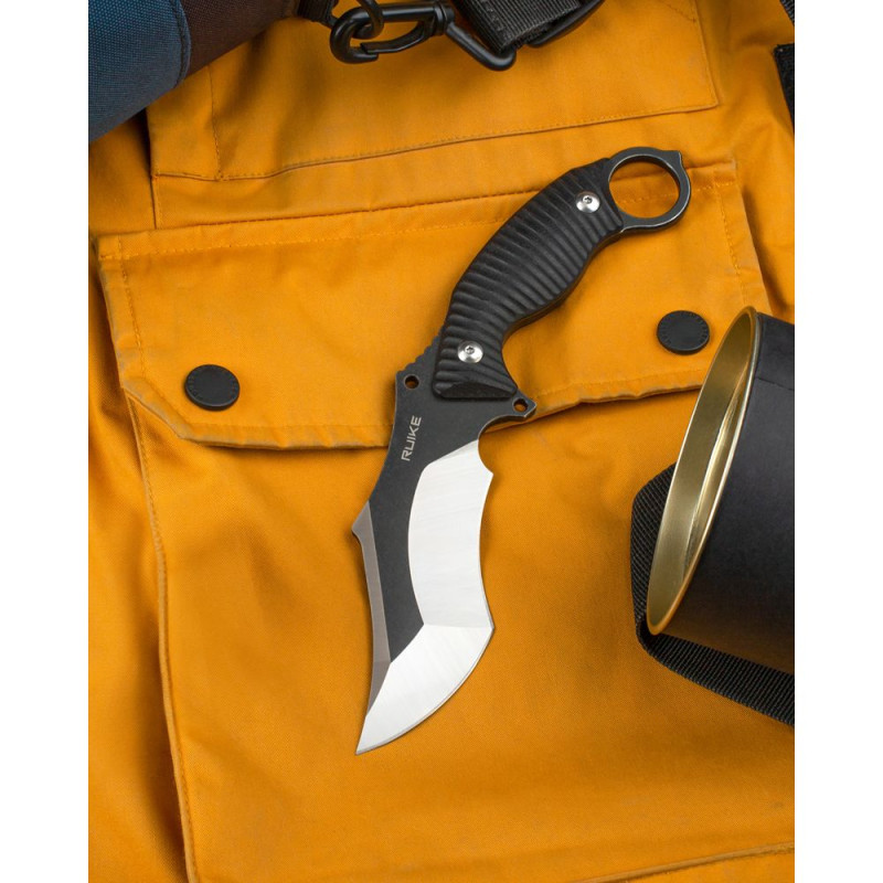 Модель ножа Ruike F181-B1 була створена для тактичного використання. Її можна застосовувати для цілей туризму і активного відпочинку. Ніж – міцний, з фіксованим лезом, різновиди «керамбит». Є заднє запобіжне кільце, рукоять вироби ергономічної форми, а текстура ручки гарантує зручний хват. Ніж досить надійний. У нього в комплекті є піхви для комфортного зберігання і перенесення.