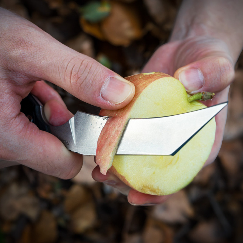 Клинок сягає 86 мм у довжину та має вигнуте лезо з прямим заточуванням, яке справляється з різанням всього, що трапляється йому на шляху. Тонкий кінчик особливо зручний у здійсненні акуратних розрізів, чи то тканина, гума або м'ясні харчові продукти На обуху є насічки. Вони виконують роль упору для пальця.