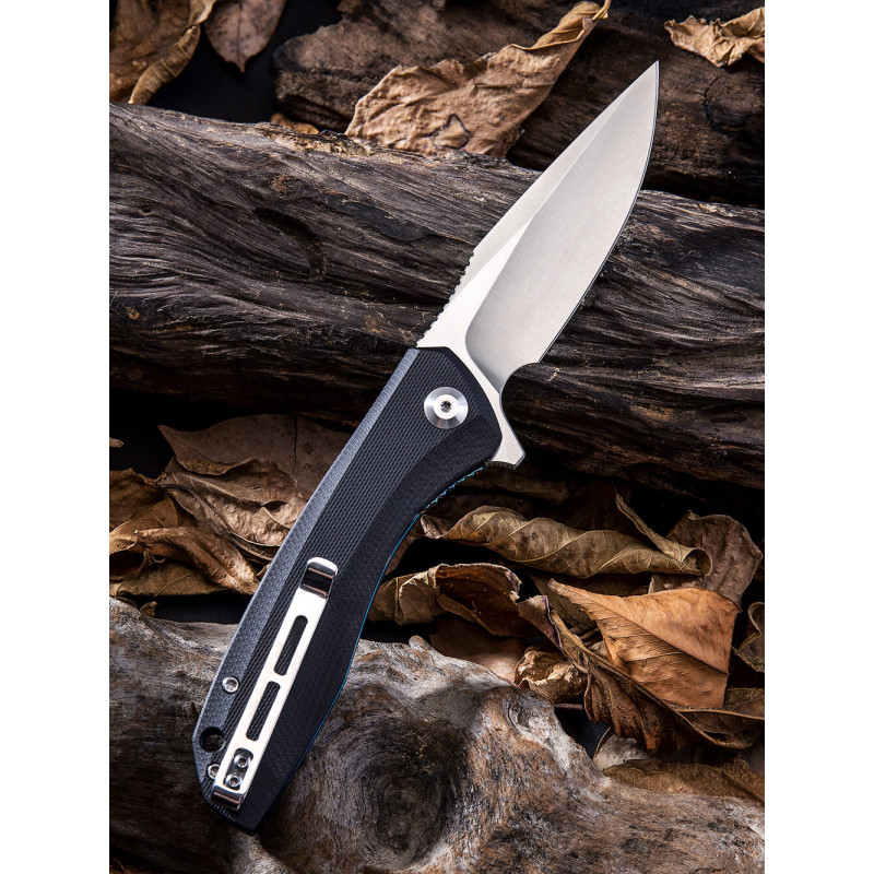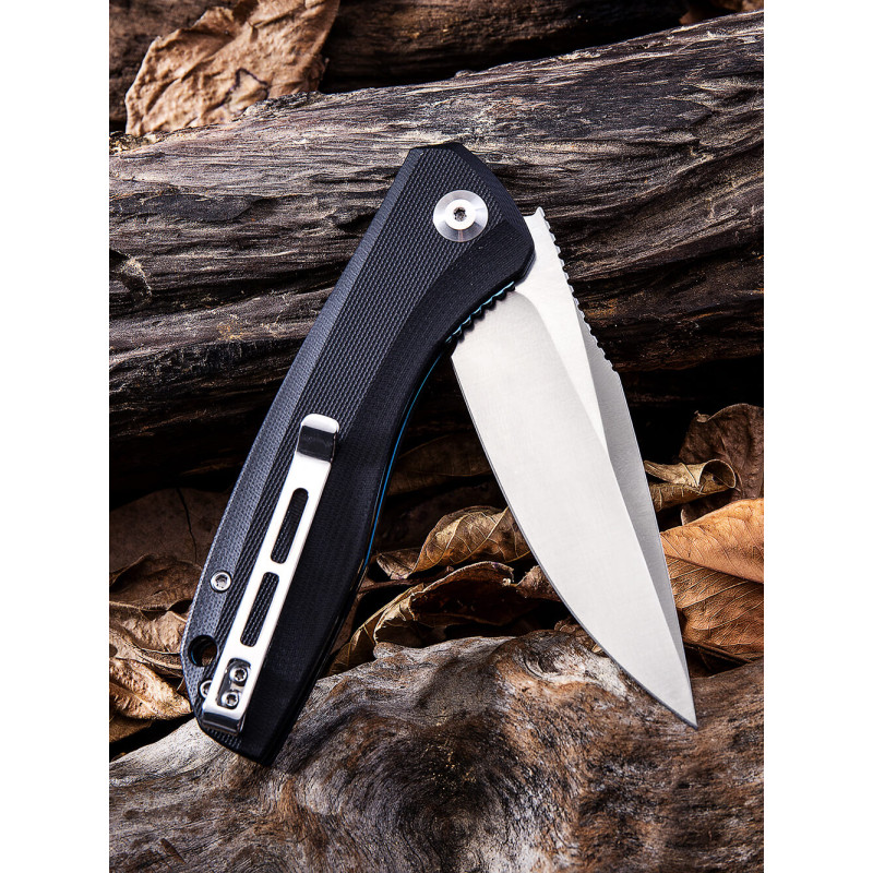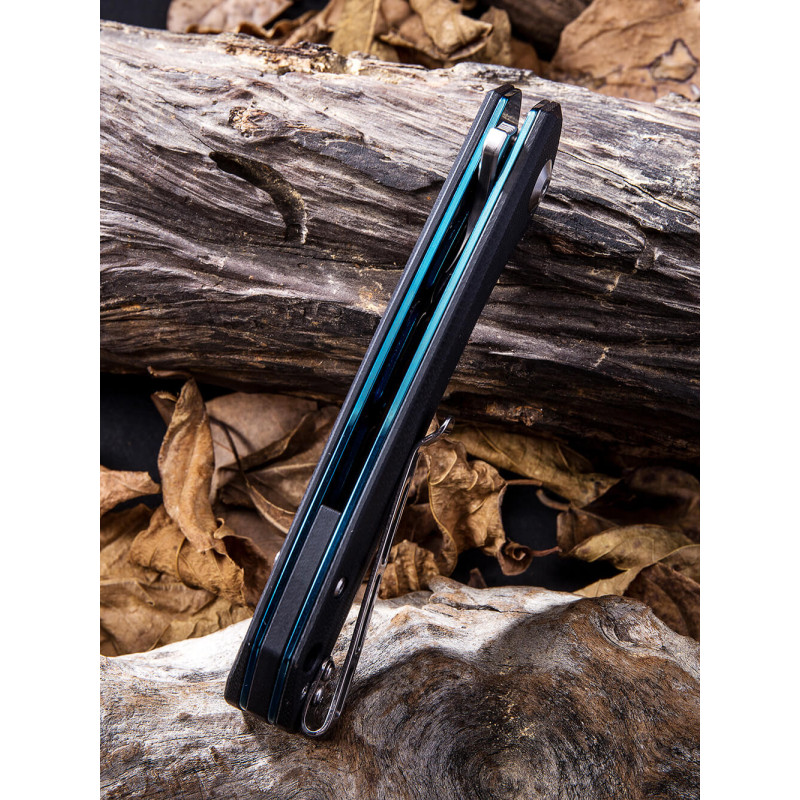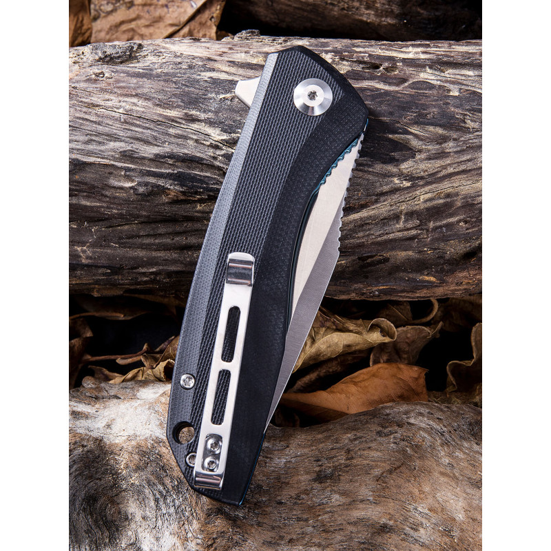 Рукоятка моделі виконана зі склотекстоліту G10. Міцний та легкий матеріал із скловолокна та синтетичної смоли. Легка текстура чудово лежить у руці та забезпечує достатнє захоплення. Є комфортна кліпса, щоб можна було підвісити ніж на кишені, рюкзаку, прикріпити до пояса.