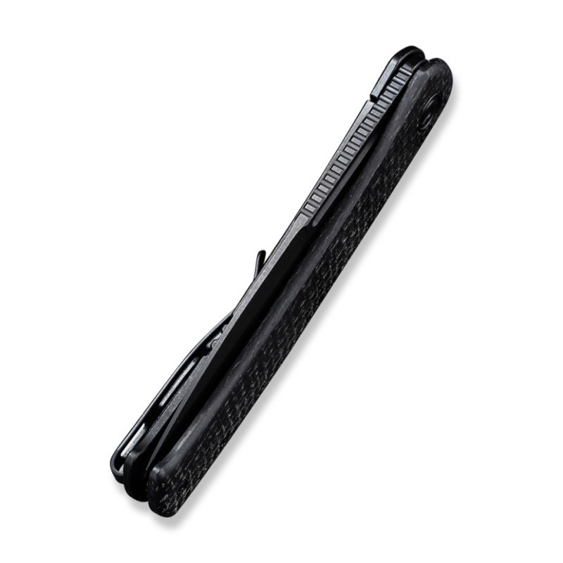 Плашка з мікарти з одного боку мінімізує ковзання ножа у долоні. З іншого боку оголена сталева конструкція руківʼя, доповнена кліпсою Tip-Up. Кліпса закріплена двома гвинтами та не передбачає зміни положення.