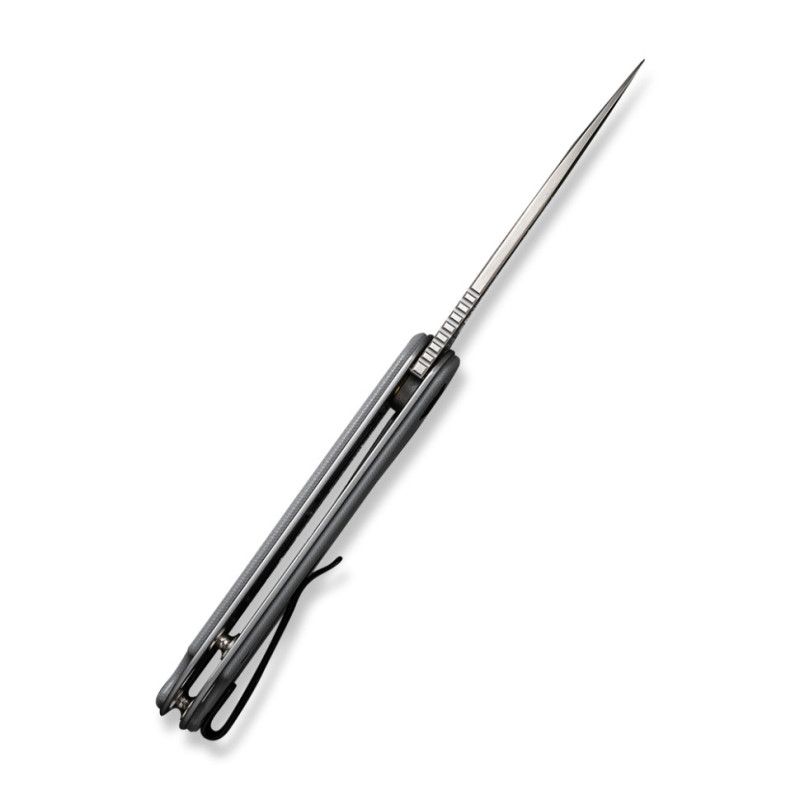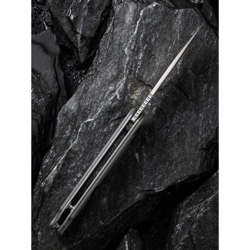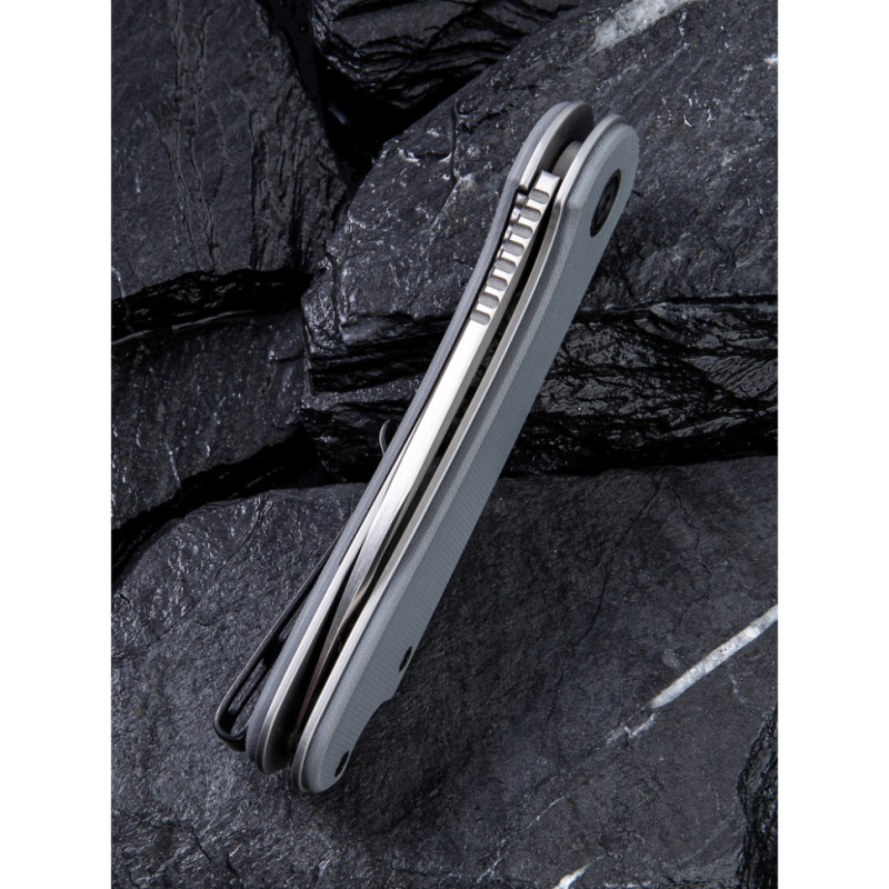 З правого боку руківʼя є чорна кліпса зі сталі. Разом з нею складаний ніж важить 82 г.