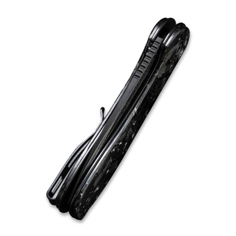 З правого боку руківʼя є чорна кліпса зі сталі. Разом з нею складаний ніж важить 77.7 грамів.