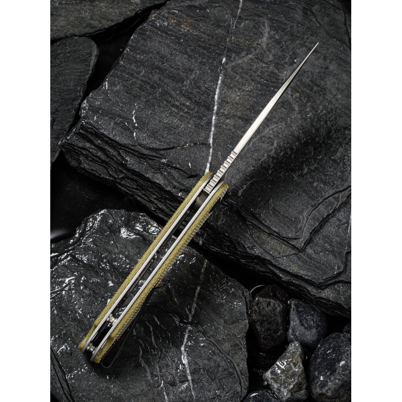 Рукоятка моделі виконана з мікарти. Це – композитний матеріал із льону та синтетичної смоли. Він виглядає чудово і гарантує достатнє зчеплення. Таким чином, керувати ножем дуже просто. Він стійкий до інтенсивних навантажень.