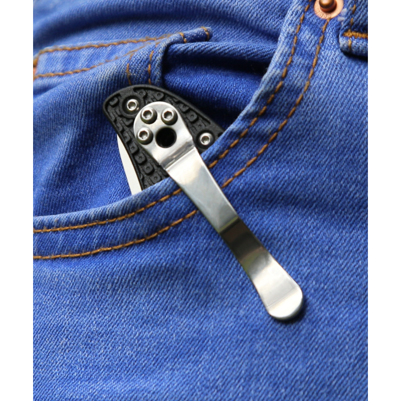 Що стосується рукоятки, то вона може бути оранжевою, чорної, рожевий або блакитний. Матеріалом для яскравих накладок послужив наповнений скловолокном нейлон. Це дуже міцний і стійкий до різного роду впливів матеріал, який прослужить багато років. Щоб ніж не прослизав у долоні, накладки зроблені текстурними. Щоб закріпити ніж у кишені і виключити його випадіння під час перенесення, рекомендується використовувати притискну кліпсу. Її можна встановити в тому положенні, яке здасться найбільш зручним (все можливе 4 варіанти).