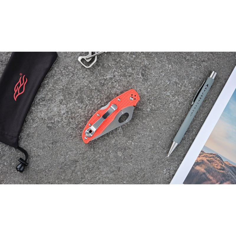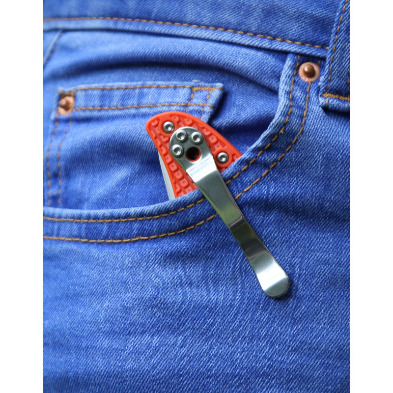 Що стосується рукоятки, то вона може бути оранжевою, чорної, рожевий або блакитний. Матеріалом для яскравих накладок послужив наповнений скловолокном нейлон. Це дуже міцний і стійкий до різного роду впливів матеріал, який прослужить багато років. Щоб ніж не прослизав у долоні, накладки зроблені текстурними. Щоб закріпити ніж у кишені і виключити його випадіння під час перенесення, рекомендується використовувати притискну кліпсу. Її можна встановити в тому положенні, яке здасться найбільш зручним (все можливе 4 варіанти).