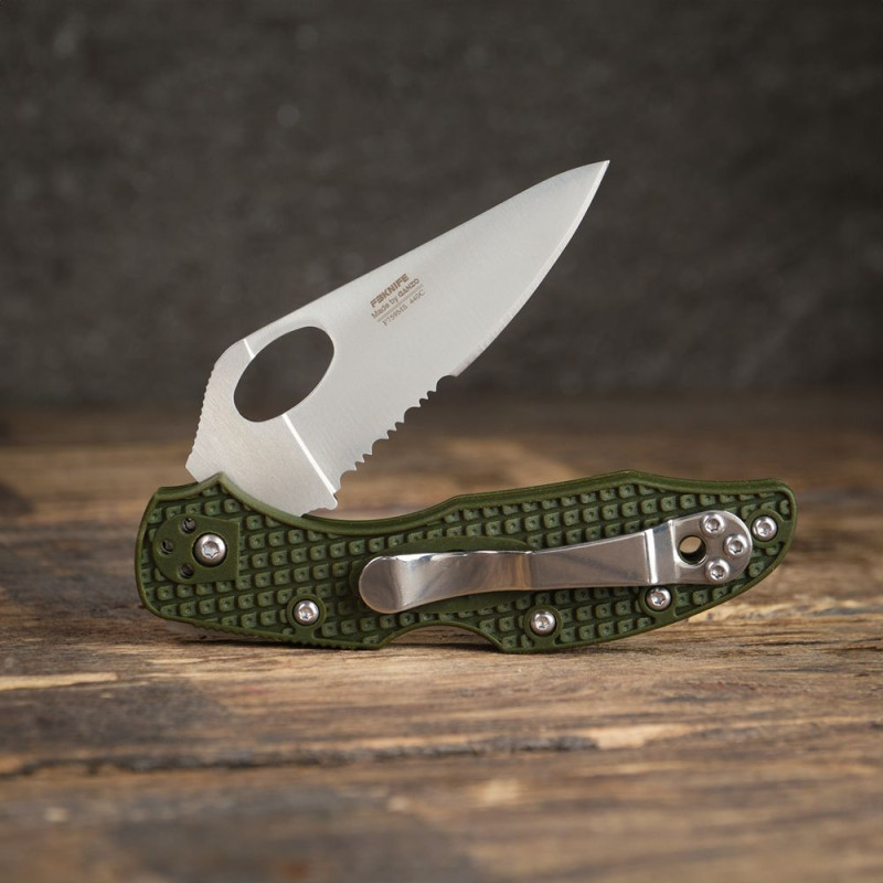 Клинок даної моделі має комбіноване лезо: половина леза ближче до основи має серрейторную заточку, а друга половина — пряму заточку. Класична пряма заточка-це універсальне лезо для більшості повсякденних завдань, в яких необхідний рівний рез, в той час як серрейтор відрізняється більш тривалим утриманням гостроти і призначений для виконання специфічних завдань. Зубчаста кромка ефективно справляється з різом волокнистих матеріалів, таких як стропи, мотузки і канати, а також дозволяє швидко зрізати дрібні гілки або заточити дерев'яні кілки.