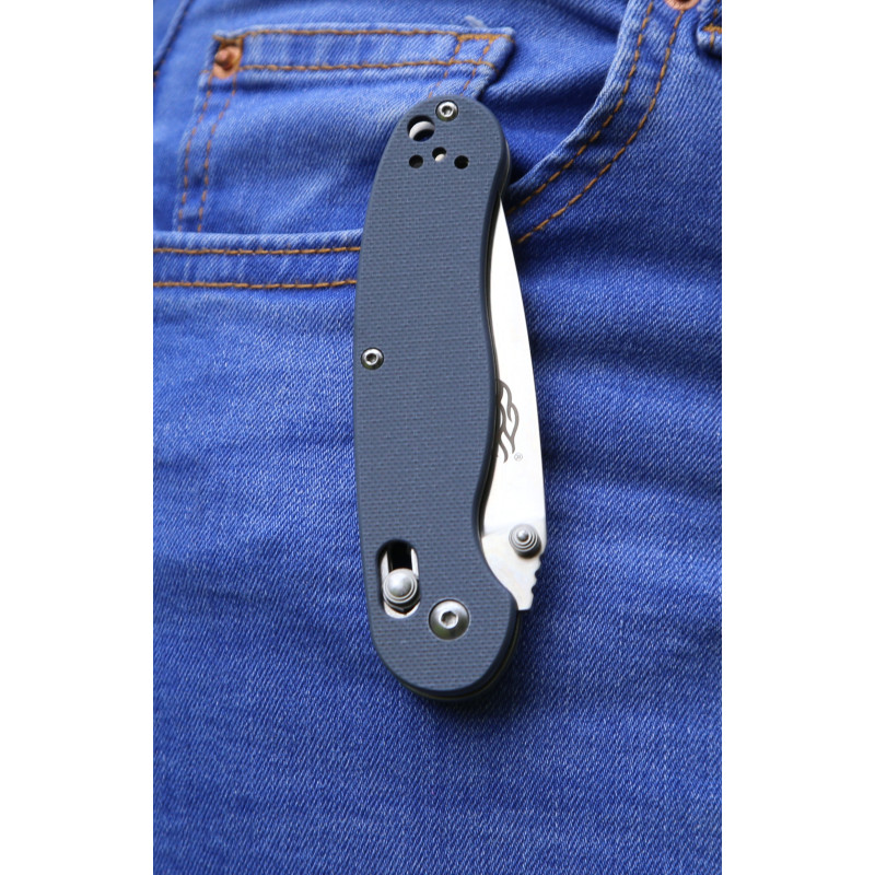 Кольори примірника – чорний, камуфляж і сірий. Творці віддали перевагу темним тонам, трохи розбавивши їх оригінальної камуфляжним забарвленням. Ручка виготовлена з практичного склотекстоліти G10. Це компонент з чудовими особливими якостями: міцний, зносостійкий, термостійкий, добре піддається фарбуванню. З таким матеріалом у складі модель набуває захищеність від впливів зовнішнього середовища. Вона стає дійсно безвідмовної в будь-якій ситуації та умовах. Ножі з матеріалом G10 довговічні і зручні в експлуатації. Злегка шорстка поверхня ручки забезпечує комфорт при захопленні – ніж надійно лягає в долоню, не ковзає і не зміщується.
