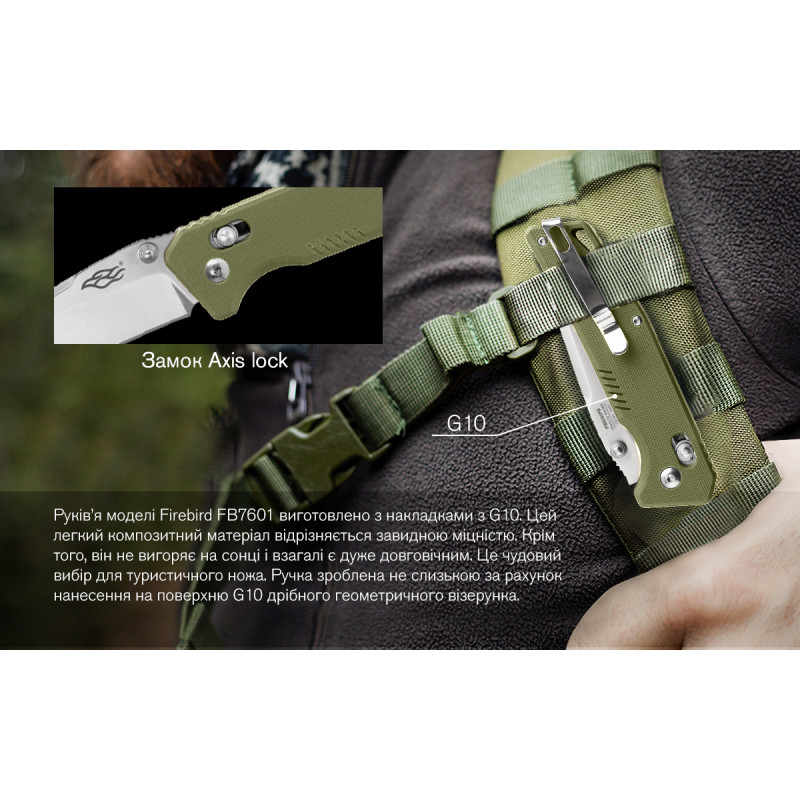 Ніж Firebird FB7601 є зручним варіантом для будь-яких поїздок на природу: на пікнік, на рибалку, в похід. Він відмінно пристосований до польових умов і здатний легко справлятися практично з будь-якими актуальними для таких умов завданнями. За допомогою даного ножа однаково зручно чистити овочі, різати інші продукти харчування, готувати до приготування свіжий улов, заготовляти невеликі тріски для розведення вогнища та виконувати інші завдання.