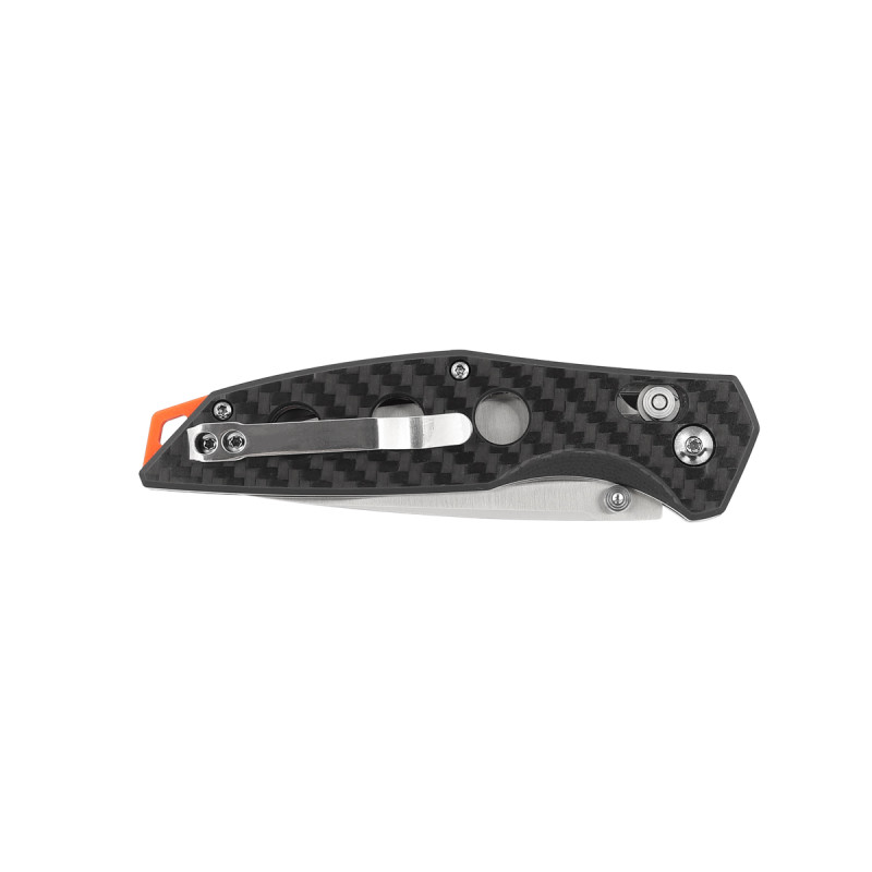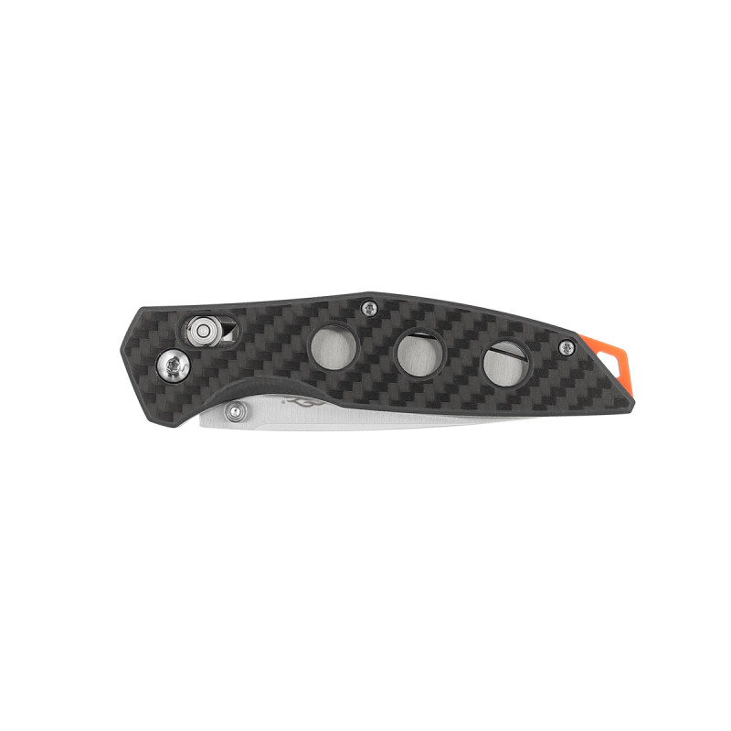Рукоять складається з декількох частин. В її основі лежать пара сталевих лайнерів, поверх яких встановлені накладки з карбону. Дана модель має спеціальні отвори, які виконують не тільки декоративну функцію, а й дозволяють максимально знизити вагу ножа без шкоди для його міцності.