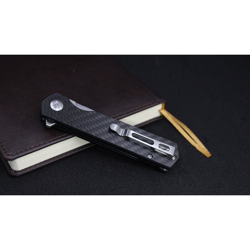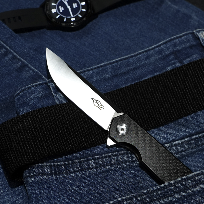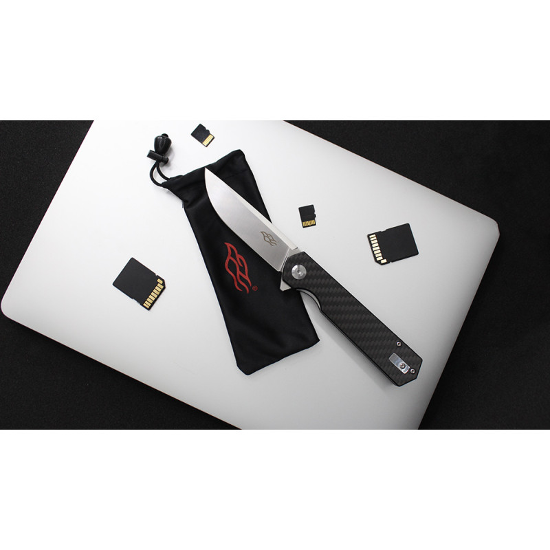 Рукоятка складного ножа Firebird FH11-CF складається лише з пари компонентів. Це 2 сталевих лайнера, що лежать в основі і забезпечують міцність конструкції і накладки з двох сторін із зносостійкого матеріалу G10 та зовнішнім шаром вуглецевого волокна (Carbon Fiber). Вони не тільки роблять дизайн ножа оригінальним, а й за рахунок якісного складання і ретельної підгонки комплектуючих дозволяють з максимальним комфортом утримувати ніж практично будь хватом.