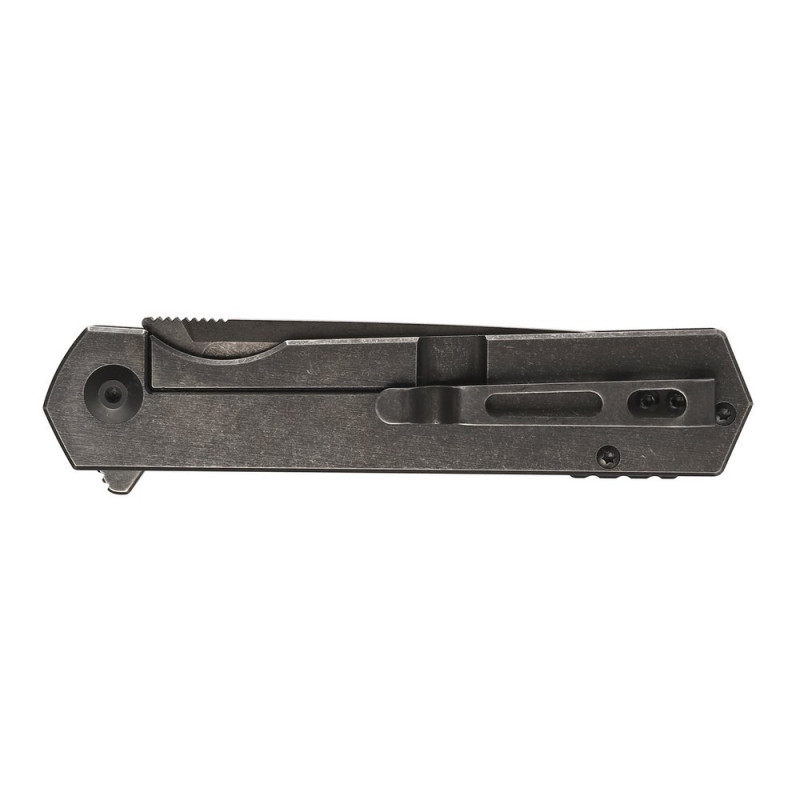 Для рукоятки виробники також вирішили використовувати метал. Проте для цієї деталі була обрана більш стійка до впливу води нержавіюча сталь. Форма ручки дуже проста, без будь-яких надмірностей у дизайні. Але оригінальність їй забезпечує така ж фінішна обробка, як і у леза ножа. А для зручності користувачів, до рукоятки прикручена невелика сталева кліпса, що дозволяє зафіксувати інструмент в кишені або на поясі.