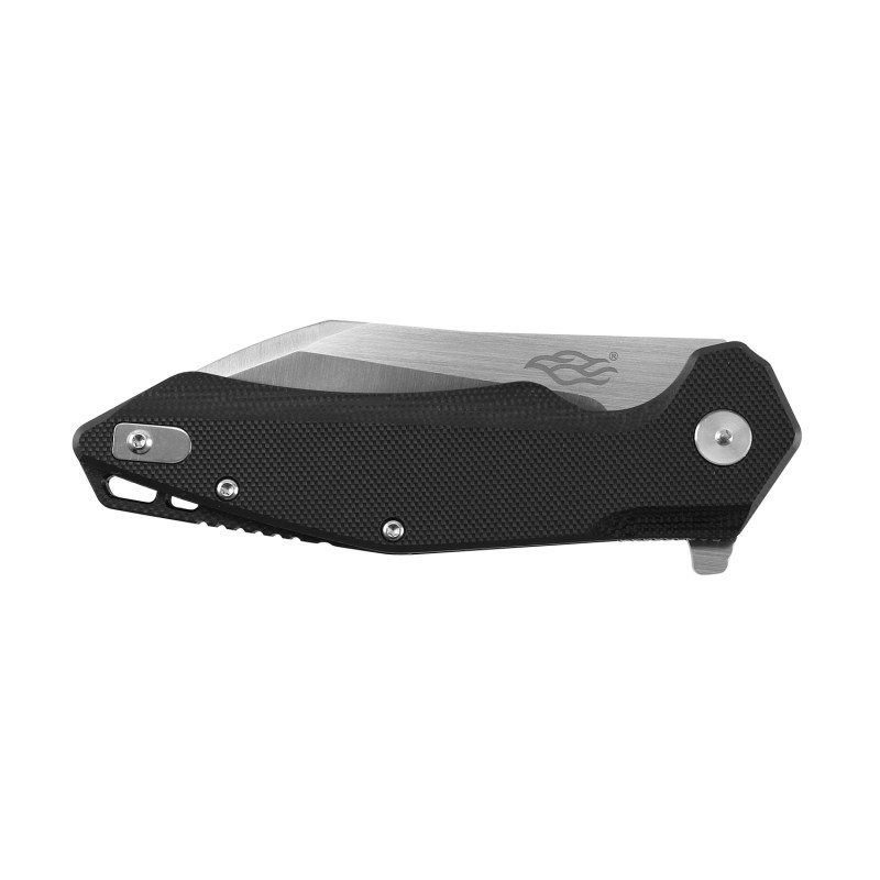 Довжина клинка цілком достатня, щоб з його допомогою було зручно виконувати всі основними різновиди робіт. Вона становить 86 мм. При цьому більшу міцність лезу гарантує товщина по обуху, рівна 3 мм. Форма клинка незвичайна для бренду Firebird - це Wharncliffe. Для такої форми характерна абсолютно пряма ріжуча кромка, наявність фальшлеза на обуху, а також гостро заточений кінчик леза. Також необхідно сказати, що поверхня ножа відшліфована методом сатинування, за рахунок чого поверхня стали нагадує атлас, на якому видно безліч ледве помітних рисок. Такі ножі менше блікують, а невеликі подряпини на їх поверхні залишаються непомітними.