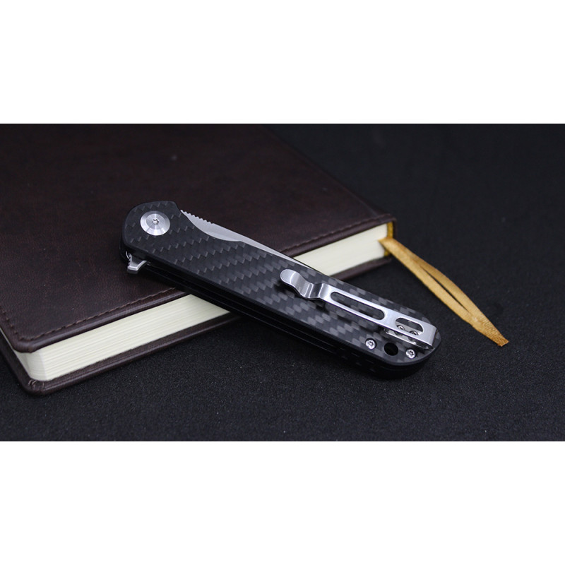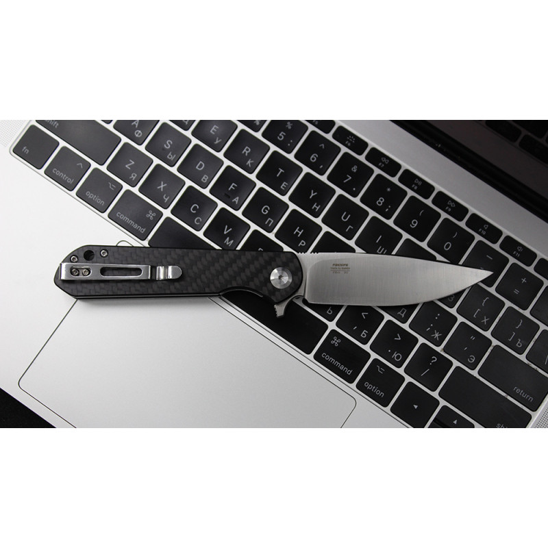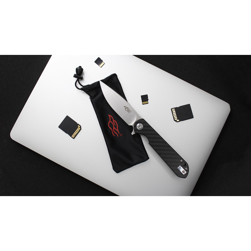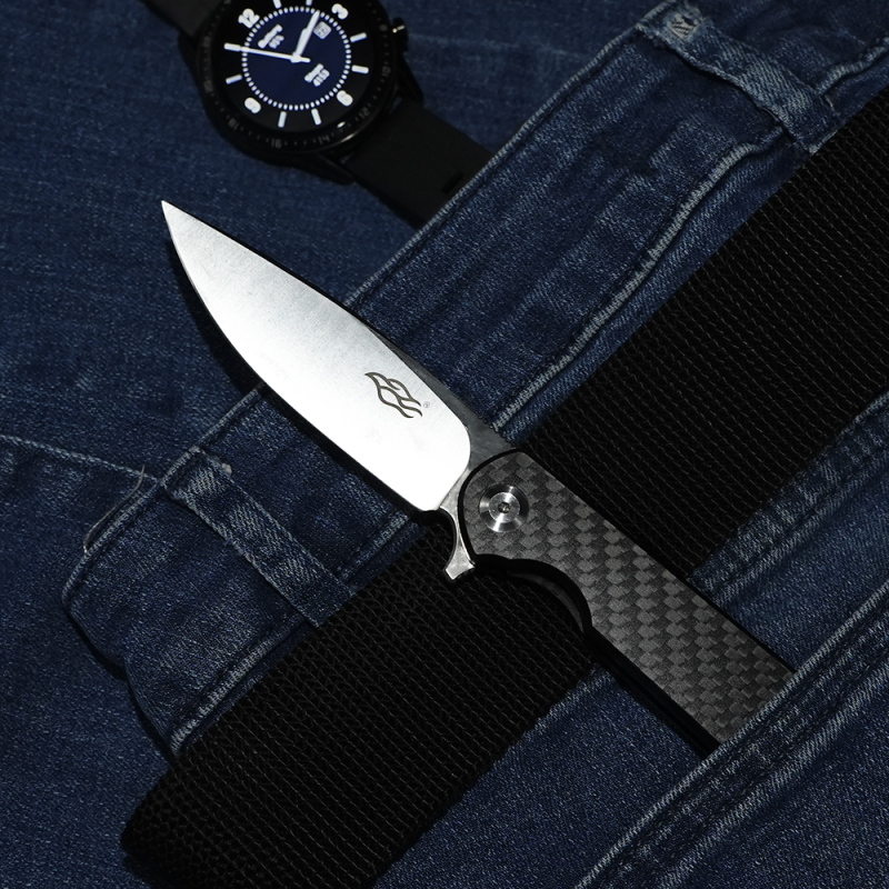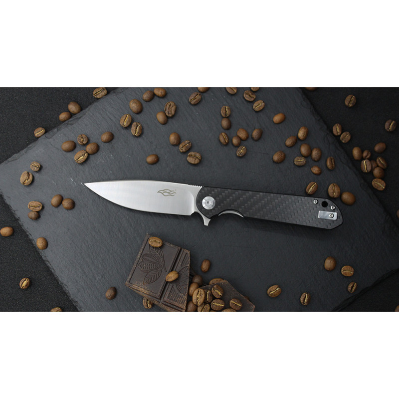 Ніж FH41-CF відразу сподобався всім, як тільки з'явився на ринку. Він універсальний і міцний, виробник продумав кожну дрібницю. Форма клинка класична – drop-point, з приспущеним до вістря обухом. Виготовляється він із високоякісної сталі D2 з твердістю 60 HRC. Тип відкривання ножа - Flipper, який показує високу надійність.