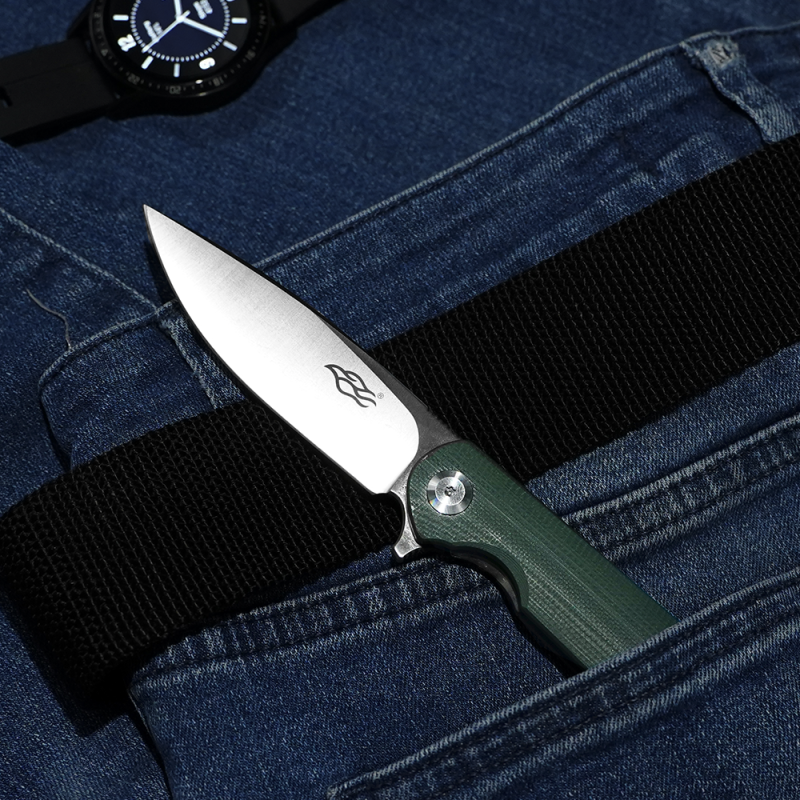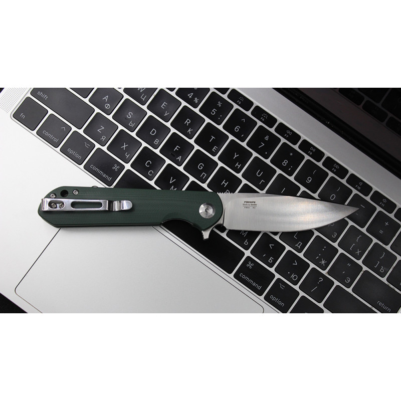 Ніж FH41 відразу сподобався всім, як тільки з'явився на ринку. Він універсальний і міцний, виробник продумав кожну дрібницю. Форма клинка класична – drop-point, з приспущеним до вістря обухом. Виготовляється він із високоякісної сталі D2 з твердістю 60 HRC. Тип відкривання ножа - Flipper, який показує високу надійність.