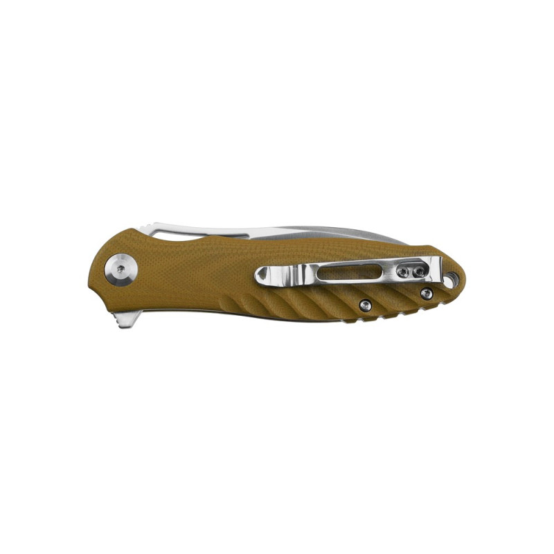 Ручка примірника зроблена з традиційного G10, що додає їй зносостійкість, стійкість до впливу температур і захищеність від механічних ушкоджень. Також цей матеріал, який являє собою склотекстоліт, легко піддається фарбуванню. Він шорсткий на дотик. Виріб комфортно тримати в руці, воно не зміщується, не ковзає. Ніж відносять до категорії фліпперів.