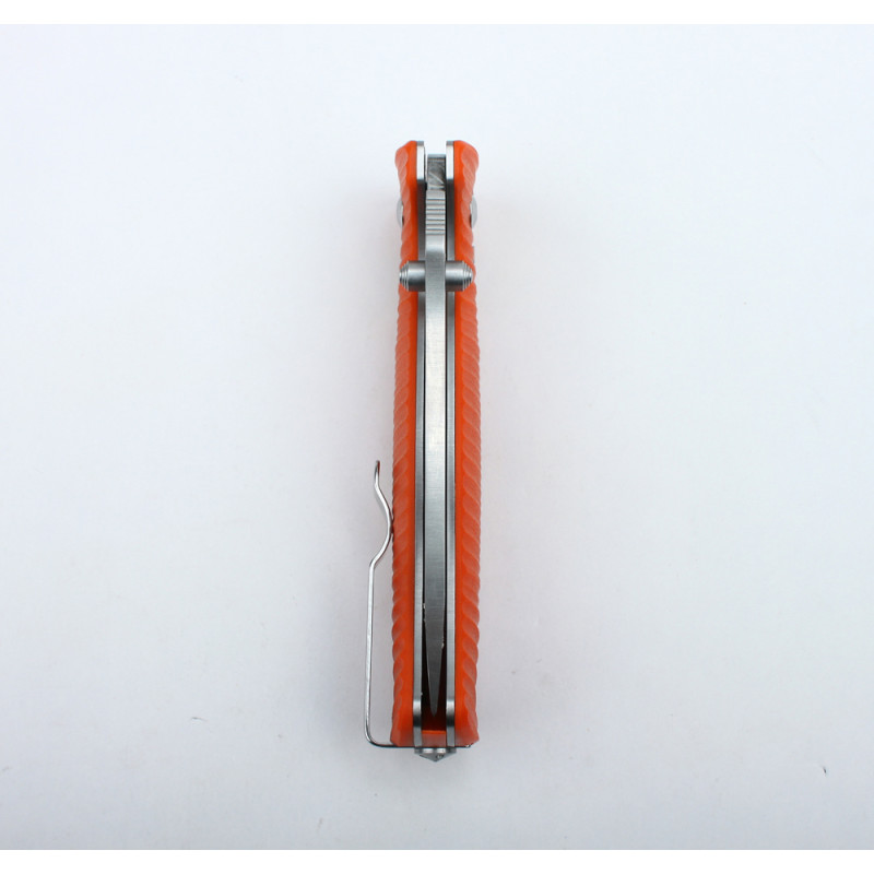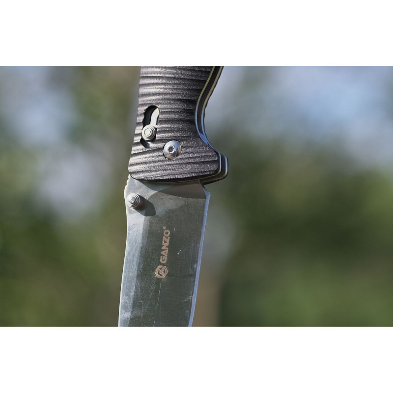 Для накладок на рукоятку ножа виробники використовували сучасний вид пластику високої міцності під назвою G10. По суті, він являє собою композитний матеріал з епоксидних смол і склотканини. Цей матеріал володіє високою міцністю, добре витримує удари, протистоїть волозі і довгий час зберігає яскравий колір. Рукоятка ножа Ganzo G720 нерівна. Така форма одночасно грає роль елемента дизайну і сприяє надійному утриманню.