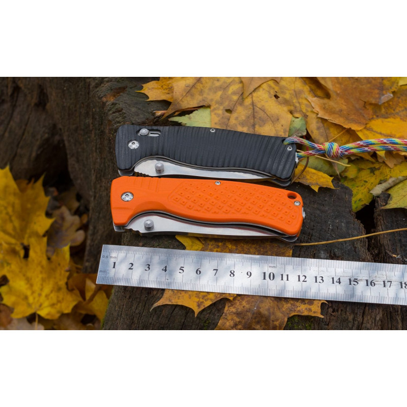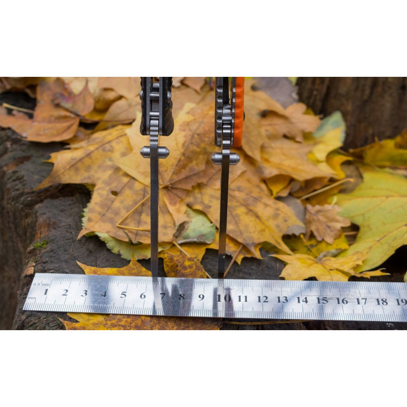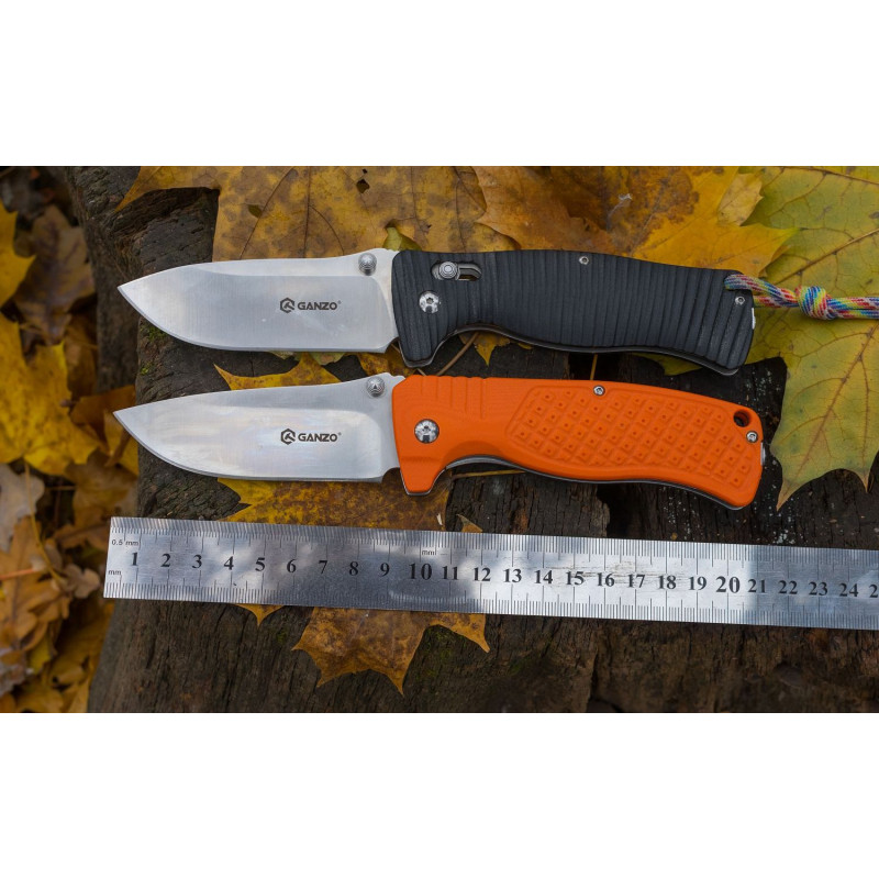 Довжина Ganzo 722 у відкритому вигляді становить 21 см. з них 9 см припадає на лезо з універсальною прямий заточуванням, товщина якого з боку обуха дорівнює 4 мм. у складеному вигляді довжина ножа дорівнює 12 см.