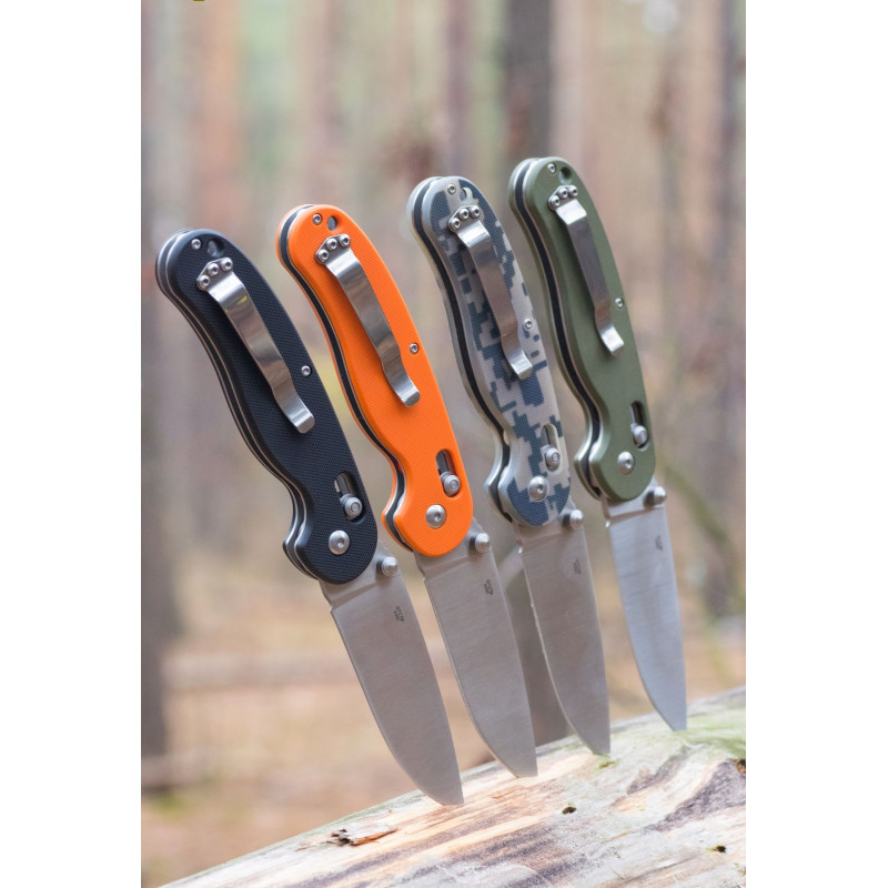 Рукоятка кожного ножа Ganzo 727m облицьована накладками зі склопластику G10. Це сучасний композитний матеріал з високими показниками зносостійкості і здатністю витримувати вплив багатьох хімічно активних речовин. Для вибору доступні чотири колірних варіанти рукоятки: чорний, помаранчевий, болотно-зелений і камуфляжний, незалежно від кольору, поверхня будь рукоятки текстурована, щоб його можна було міцніше тримати в руках. Крім того, виробники завбачливо розмістили на рукоятці кліпсу для кріплення ножа на ремінь і отвір для протягування темляка.
