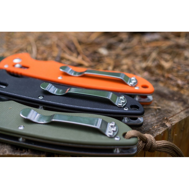 Рукоять ножа отримала дві накладки з надійного склопластику G10. Запасу його міцності повністю достатньо для ножа, який буде використовуватися в мисливських і туристичних цілях. На ручці закріплена сталева кліпса, яка допомагає закріпити ніж на ремені, щоб він не загубився. Додатково передбачена можливість приєднання темляка для страховки на зап'ясті або ж на лямці рюкзака. Колір рукояті в даній моделі може бути чорним, помаранчевим або ж зеленим. Також на рукоятці видно частину замку для фіксації леза. Це механізм конструкції Axis з металевим штифтом. Для відкривання ножа, на лезі розташований невеликий шпеник.